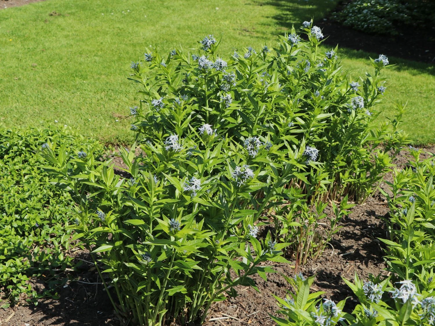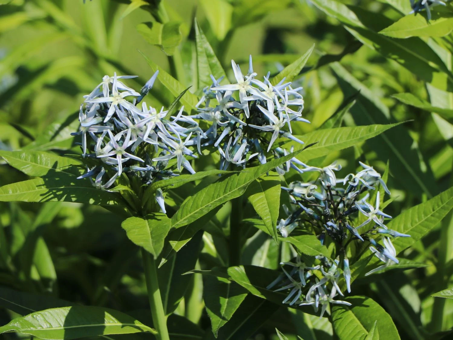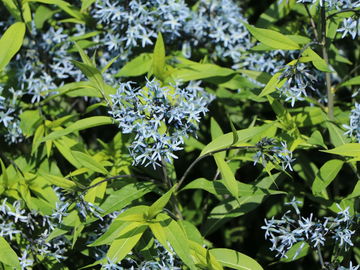 Mit seinen graugrünen, lanzettlichen Blättern bietet der Röhrenstern geniale optische Variationen im Garten. Dieses toppt er selber mit seinen hellblauen Blütendolden. Beheimatet ist der Amsonia tabernaemontana an der Ostküste Nordamerikas. Einen erfreulichen Anblick liefert diese schöne und dicht belaubte Staude das ganze Jahr hindurch. Es beginnt mit dem lilafarbenen Austrieb im Frühjahr und endet mit der leuchtend gelben Herbstfärbung. Die Sternblüten erscheinen im Frühsommer. Reizend stehen die blassblauen Sternblüten in Dolden zusammen. Gesund und attraktiv bleibt das Laub die gesamte Saison hindurch gern gesehen. Fast wie ein kleiner Busch oder Strauch wirkt der wunderschöne Röhrenstern durch seine dichte Belaubung und den horstigen Wuchs. Die entgegengebrachte Geduld der ersten Jahre wird dem Gärtner großzügig gedankt. Durch extreme Langlebigkeit und durch ihr dankbares und unproblematisches Wesen. Diese schöne Staude findet ihren Ursprung im Nordosten der USA, Oklahoma, Virginia, dem zentralen Nordosten der USA, Kansas und dem Südosten der USA.