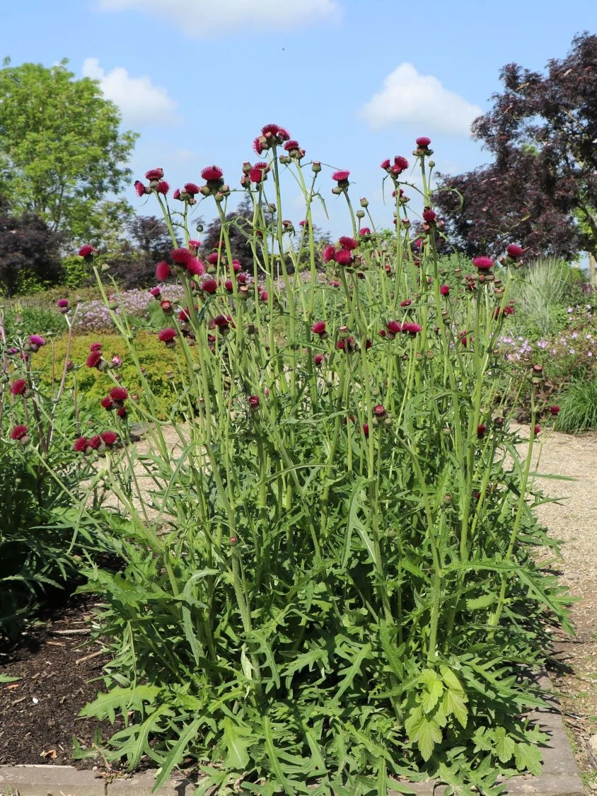 Die Blüten der Kratzdistel ‚Atropurpureum‘ erscheinen im tiefen Purpurrot und lassen sich in der hochsommerlichen Zeit von Juli bis August bewundern. Die Pflanze erreicht eine Höhe von 70 bis 120 Zentimeter und eignet sich somit perfekt als Hintergrundpflanze für niedriger wachsende Stauden. Um eine größere Fläche zu bepflanzen, reicht es aus, zwei Exemplare auf einem Quadratmeter einzusetzen. Trotz der zauberhaften Optik präsentiert sich Cirsium rivulare ‚Atropurpureum‘ zudem als außerordentlich winterhart. Temperaturen von bis zu -28,8 °C übersteht sie ohne Schaden zu nehmen. Im Frühjahr lässt sich das erneute Austreiben beobachten und die Kälte des Winters scheint vergessen. Die Art Cirsium rivulare ist landläufig auch als Bach-Kratzdistel sowie in der südlichen Schwäbischen Alb als Trommelschlägel bekannt.