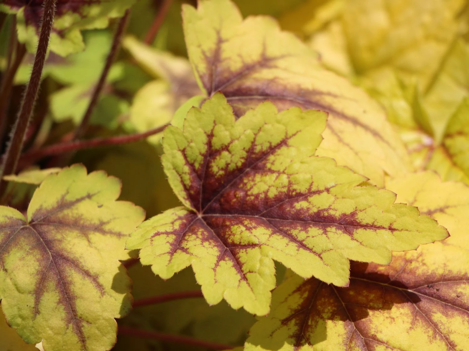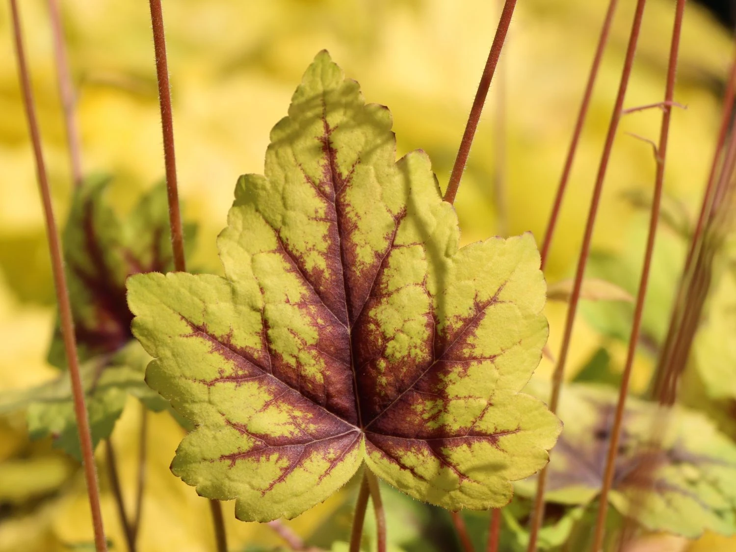 Die Bastard-Schaumblüte ‚Alabama Sunrise‘ ist ein wunderschöner Bodendecker. Durch seine mit den Jahreszeiten wechselnden Blattfarben, sorgt er regelmäßig für Abwechslung. Im Frühjahr sind die Blätter hellgelb gefärbt. Bis zum Spätsommer wechselt die Blattfarbe zu einem leuchtenden Grün. Hier kommen die Blattadern mit ihrer tiefroten Färbung wunderschön zur Geltung. Beide Farben bilden einen starken Kontrast. Im Herbst verfärben sich die Blätter allmählich nach orange bis rosa. Die Blattadern bleiben das ganze Jahr über rot gefärbt.