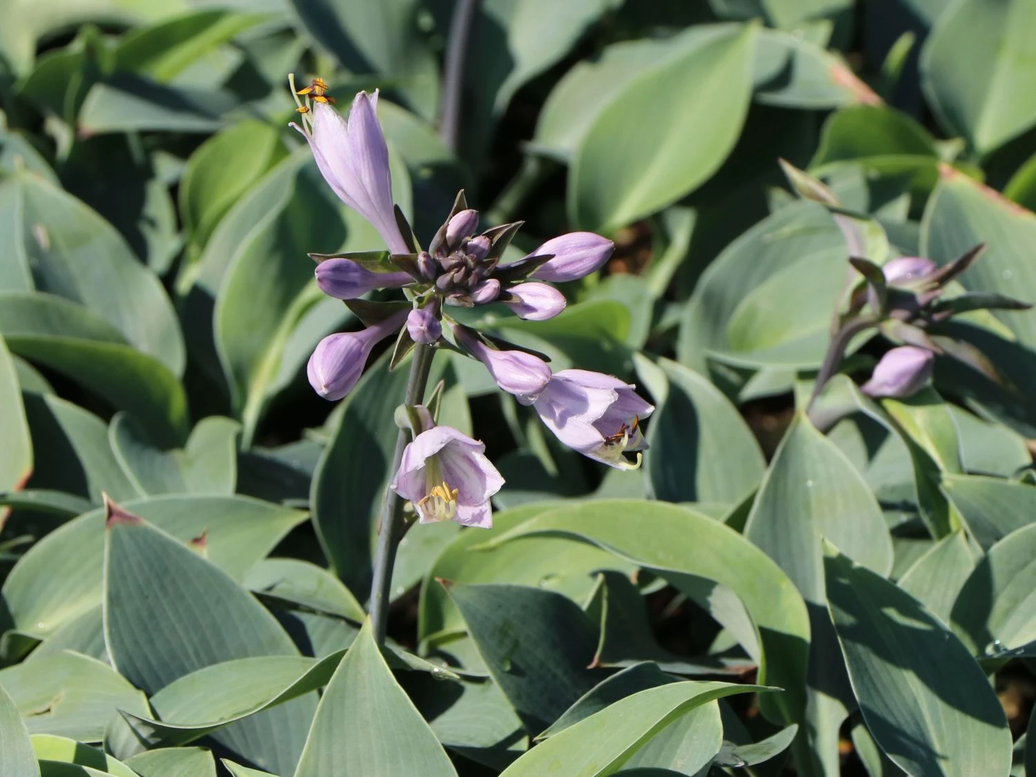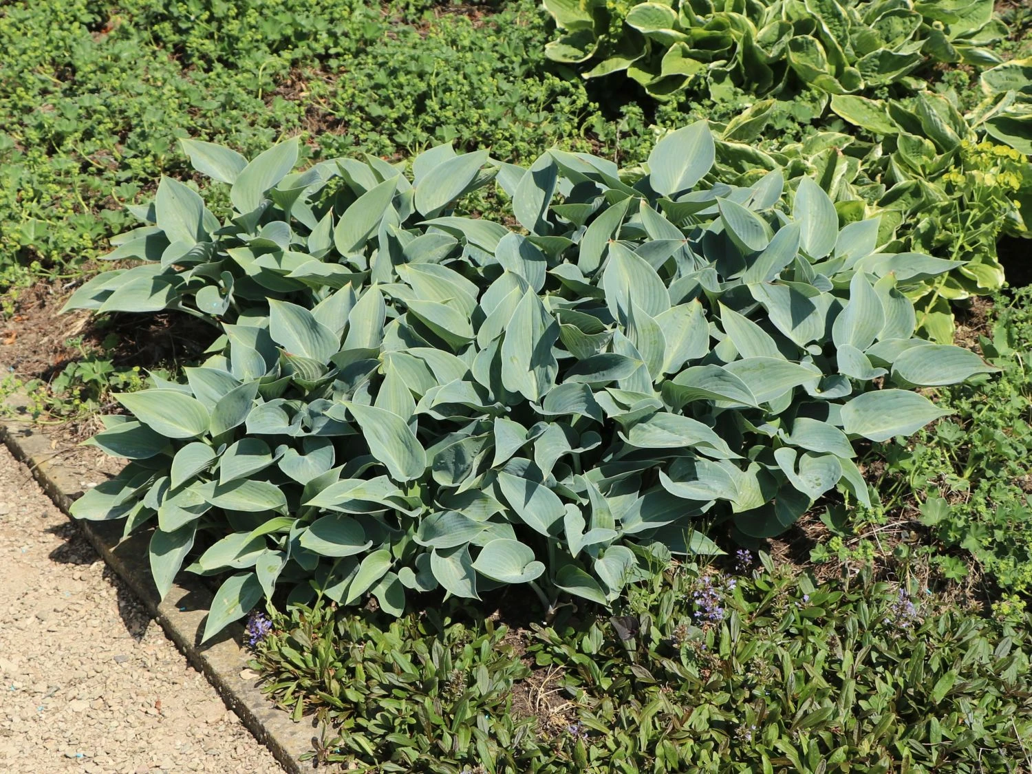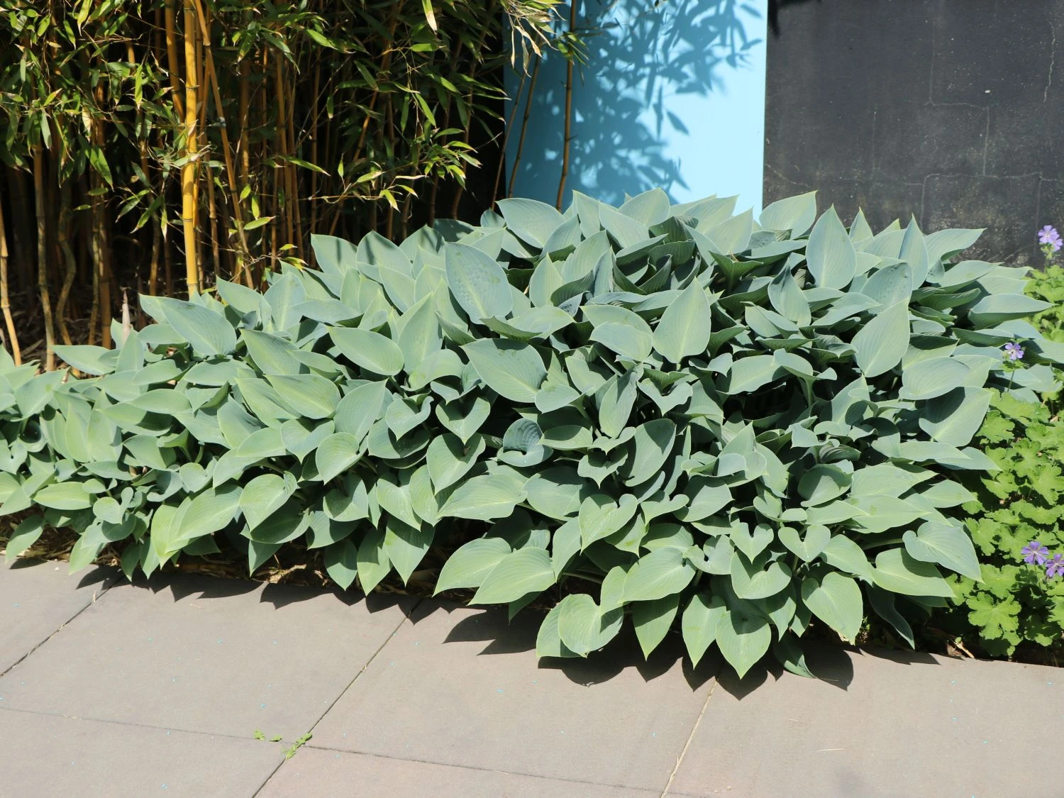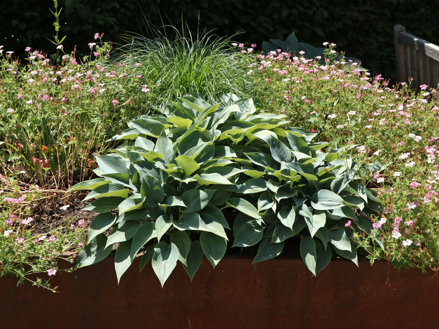 Die Graublaue Funkie ‚Halcyon‘ (botanisch Hosta tardiana ‚Halcyon‘) oder auch Graublaue Herzblattlilie genannt ist eine Staude, die zur Familie der Hostaceae (Herzblattliliengewächse) gehört. Zu ihren herausragendsten Merkmalen gehören, wie ihr deutscher Name schon sagt, die blaugrauen, herzförmigen Blätter, die in jedem Beet sehr edel und dekorativ wirken und dem Auge des Betrachters schmeicheln. In der Blütezeit von Juli bis September bilden sich kleine, blass-violette Blüten in Glöckchenform, die sich an aufrechten Stängeln befinden. Da die Pflanze sich nicht nur in die Höhe, sondern auch sehr schön in die Breite entwickelt, sollten nicht mehr als 2 – 4 Pflanzen pro Quadratmeter gesetzt werden.
