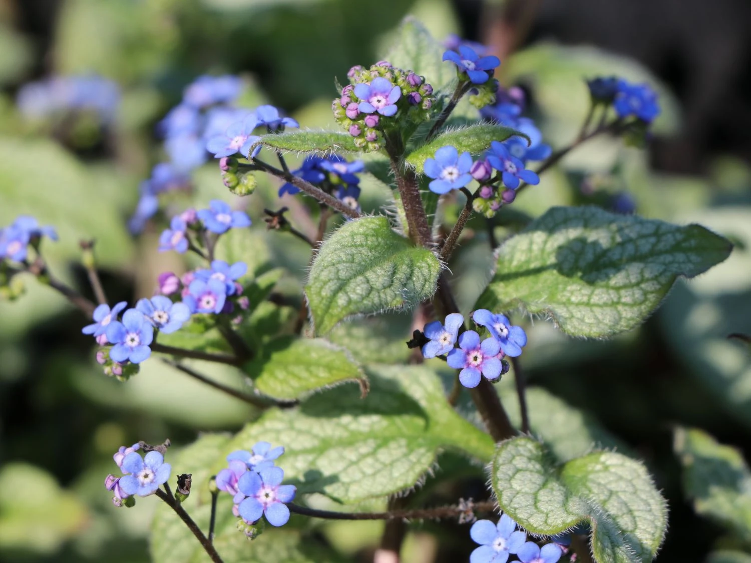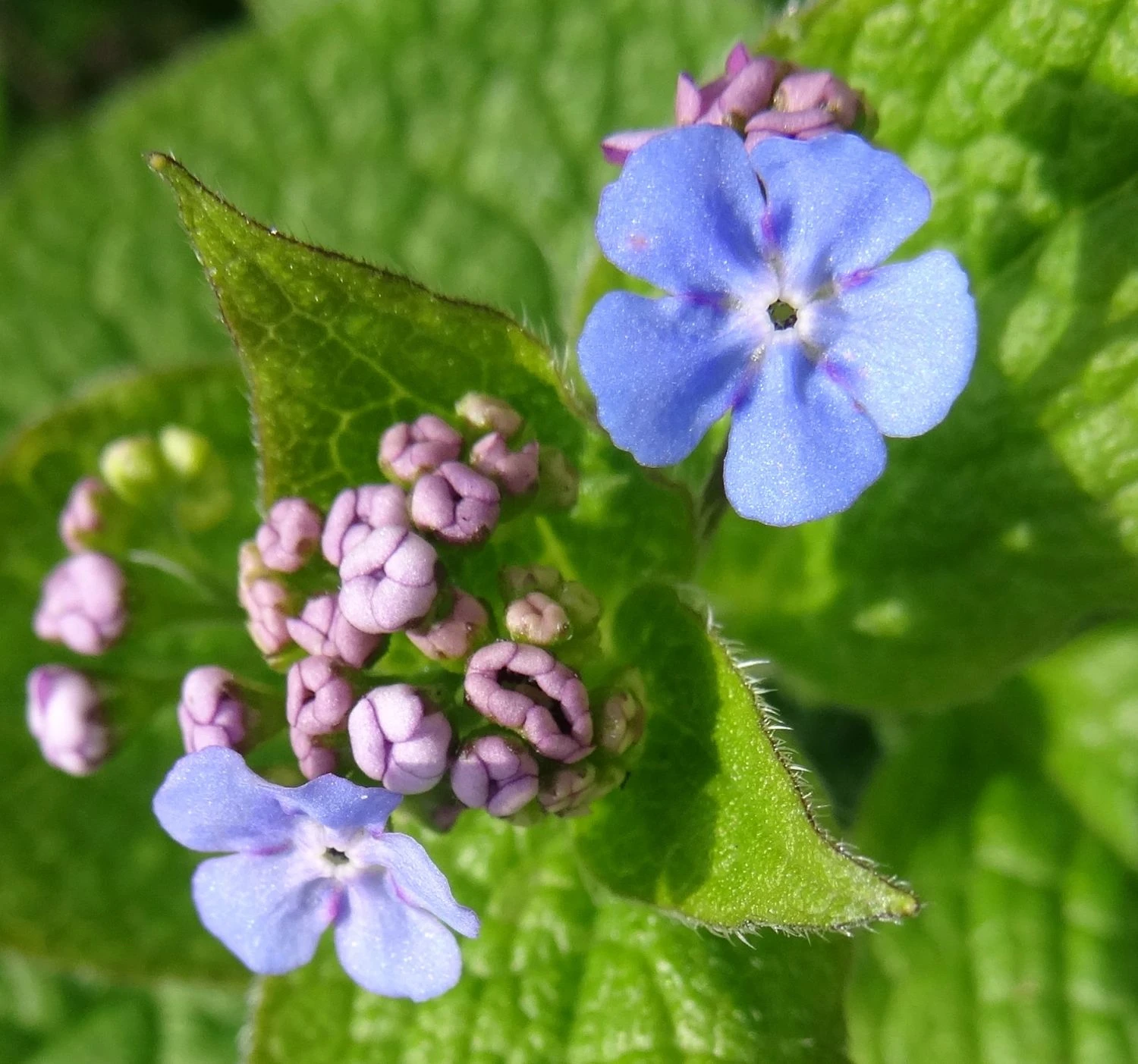 Die lang gestielten Blätter sind 20 bis 25 Zentimeter groß. Sie sind herzförmig und an ihren Enden zugespitzt. Die außergewöhnlich schönen Blätter sind hellgrün und silbrig marmoriert. Das verleiht ihnen einen zauberhaften Charme. Grundständig stehen die kleinen Schönheiten in der Erde. Es hat den Anschein, als würden sie sich unentwegt aus dem Boden herausschälen, um sich den besten Platz an der Sonne zu erstreiten. Wie ein silbriger Teppich erscheint das Großblättrige Kaukasus-Vergissmeinnicht ‚Silver Wings‘ mit seinem herrlichen üppigen Wachstum, das vor überbordender Fülle strotzt. Es entsteht ein wunderschönes Bild im Beet. Die rauen Blätter sind behaart und vermitteln einen weichen Eindruck. Wohl jeder verspürt den Wunsch, die weichen Blätter zu berühren. Im zeitigen Frühjahr bildet das Großblättrige Kaukasus-Vergissmeinnicht ‚Silver Wings‘ seine Blüten aus, die sich an langen Stielen entwickeln. Zauberhafte Rispen, dicht an dicht von winzigen blauen Blüten besetzt, schiebt die Brunnera macrophylla ‚Silver Wings‘ über ihr Blattwerk hinweg. Sanft wiegen sie sich in der warmen Sommerluft. Wie im Zeitraffer entsteht ein traumhaftes Blütenmeer, das unzählige wundervolle und entzückende Blüten mit der Sonne um die Wette strahlen lässt. Diese unbändige Pracht öffnet das Herz. Nahezu elfenhaft schimmern diese zart und zerbrechlich wirkenden Blüten.