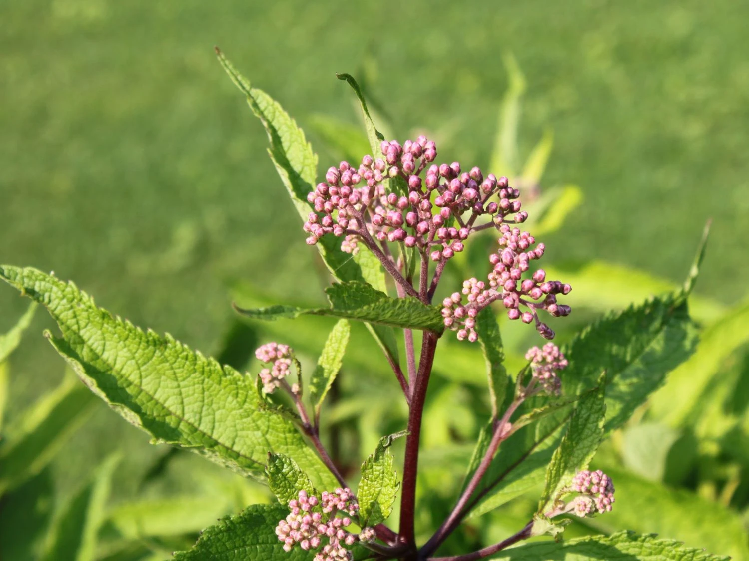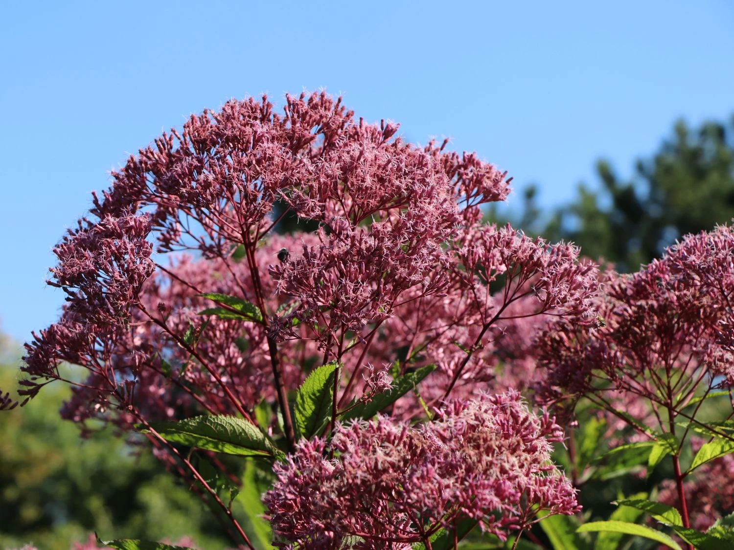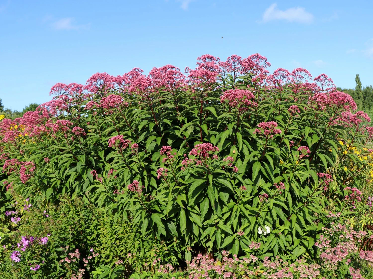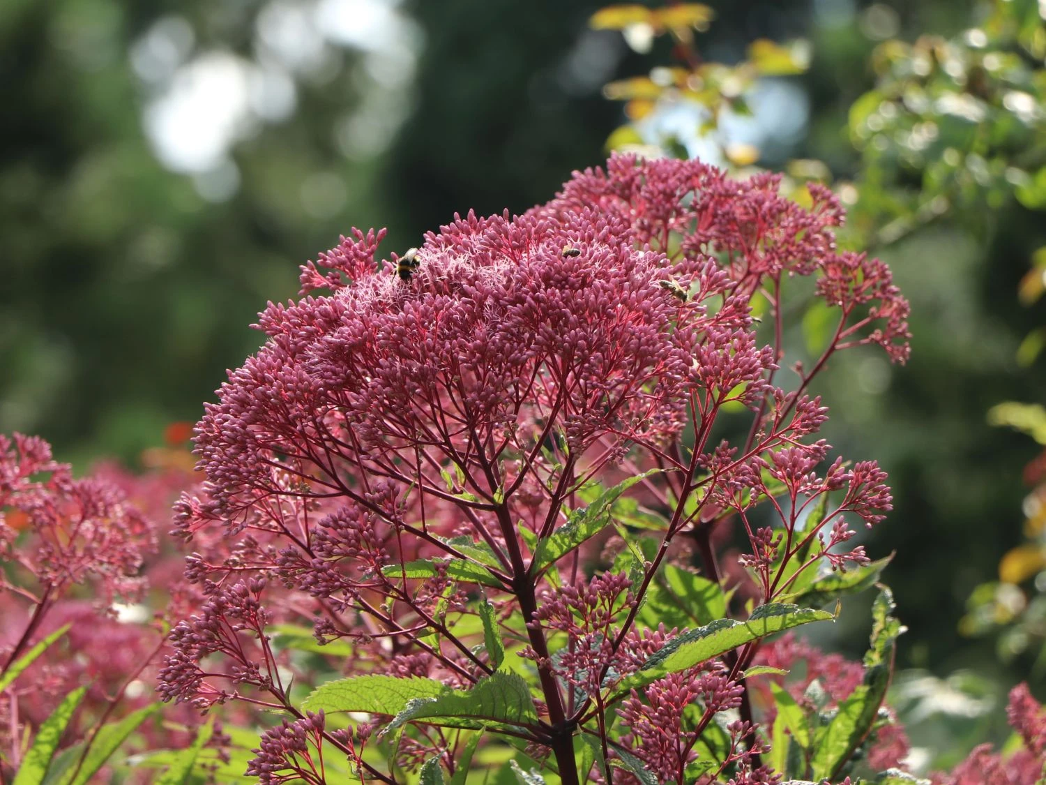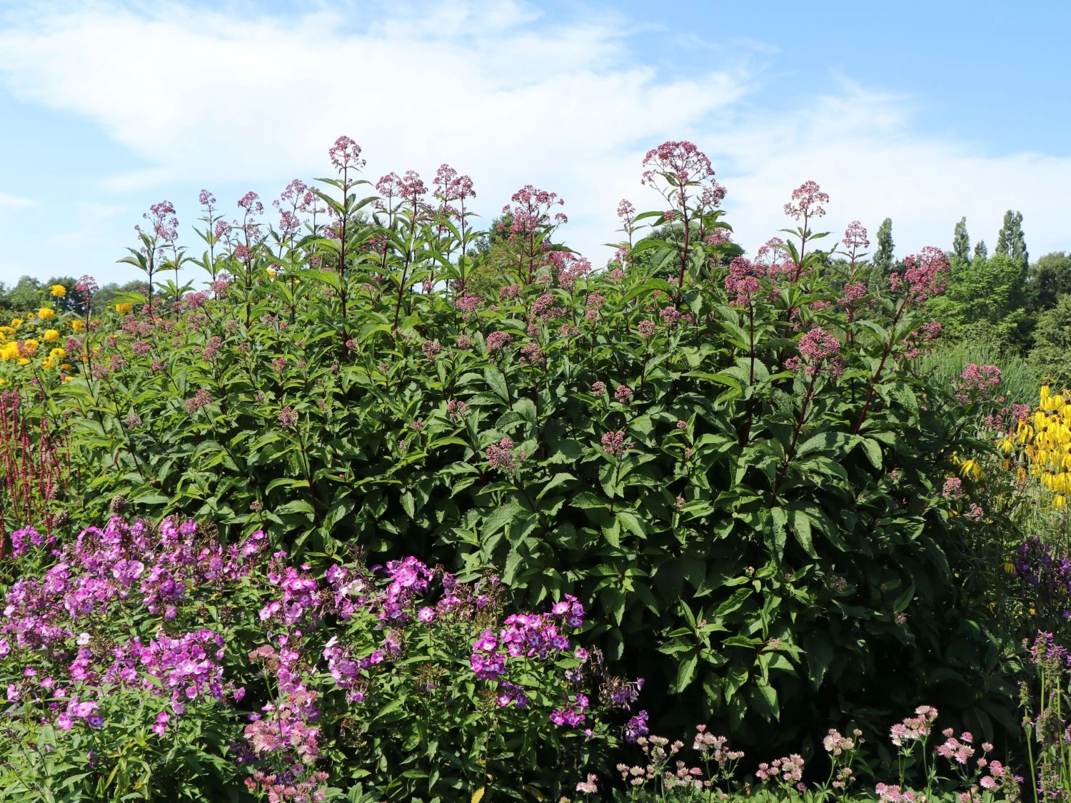 Die Beetstaude Eupatorium fistulosum ‚Glutball‘, im deutschen Großer Wasserdost genannt, kommt aus dem östlichen Nordamerika. Er blüht im Zeitraum von Ende Juli bis Anfang Oktober mit schönen purpurrote Blütendolden. Die auffällige und große Staude, bevorzugt die volle Sonne, kann aber auch in halbschattigen Bereichen gut gedeihen.