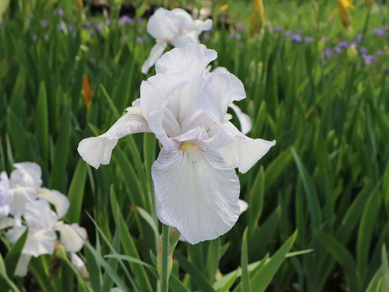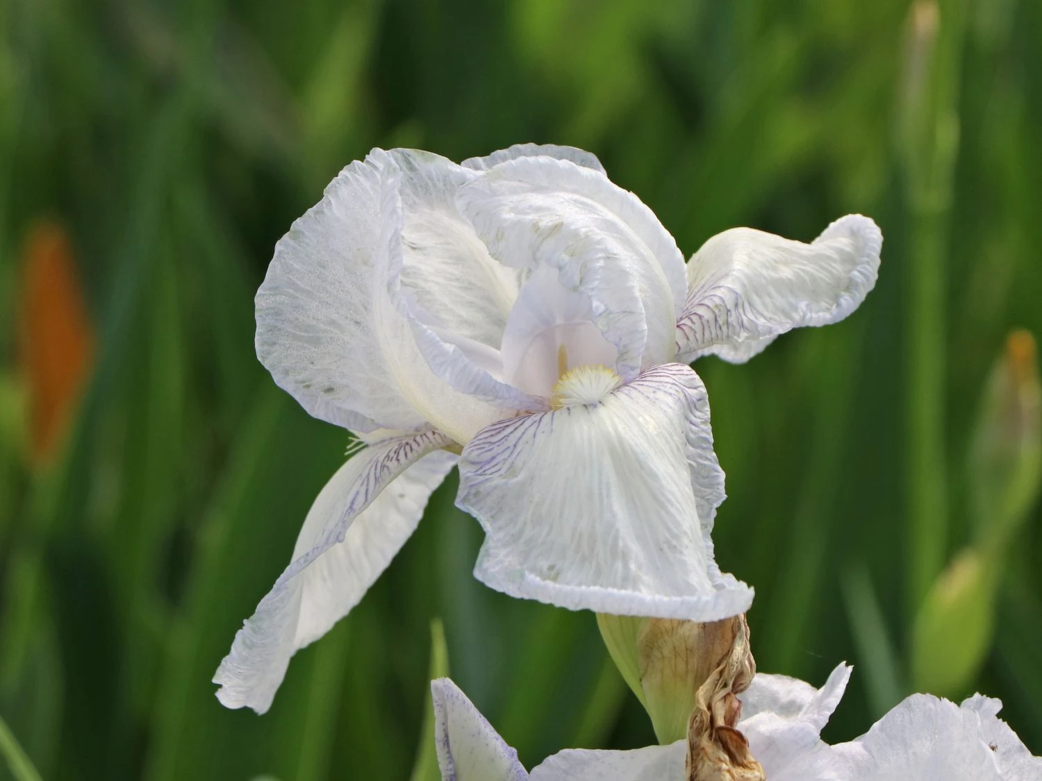 Die Hohe Schwertlilie ‚English Cottage‘ ist ein Abkömmling einer der beliebtesten Arten der bekannten Iris. Innerhalb der Familie der Schwertliliengewächse (Iridaceae) entstehen jährlich neue Sorten und die Vielfalt der Bart-Iris ist riesig. Allerdings sticht (bot.) Iris x barbata-elatior ‚English Cottage‘ in besonderer Weise aus dieser Fülle hervor: Die Hohe Schwertlilie ‚English Cottage‘ schmückt sich im Zeitraum Mai bis Juni mit glatten, cremeweißen Blüten, die von verspielten Blättern umgeben sind. Im Herbst zeigt sich nochmal eine weitere Blühphase. Die Domblätter der Blüten zeigen am Rand einen Hauch von einem zarten Lila, die Hängeblätter haben einen weißen Bart sowie einen Schlund mit zartlila Adern. Sowohl im Garten als auch auf der Freifläche lässt diese attraktive Sorte ihren Charme spielen und sorgt für einen aufregenden Anblick. Um sich den Sommer und seine Düfte ins Haus zu holen, eignen sich die Blüten der Hohen Schwertlilie ‚English Cottage‘ wunderbar für den Vasenschnitt.