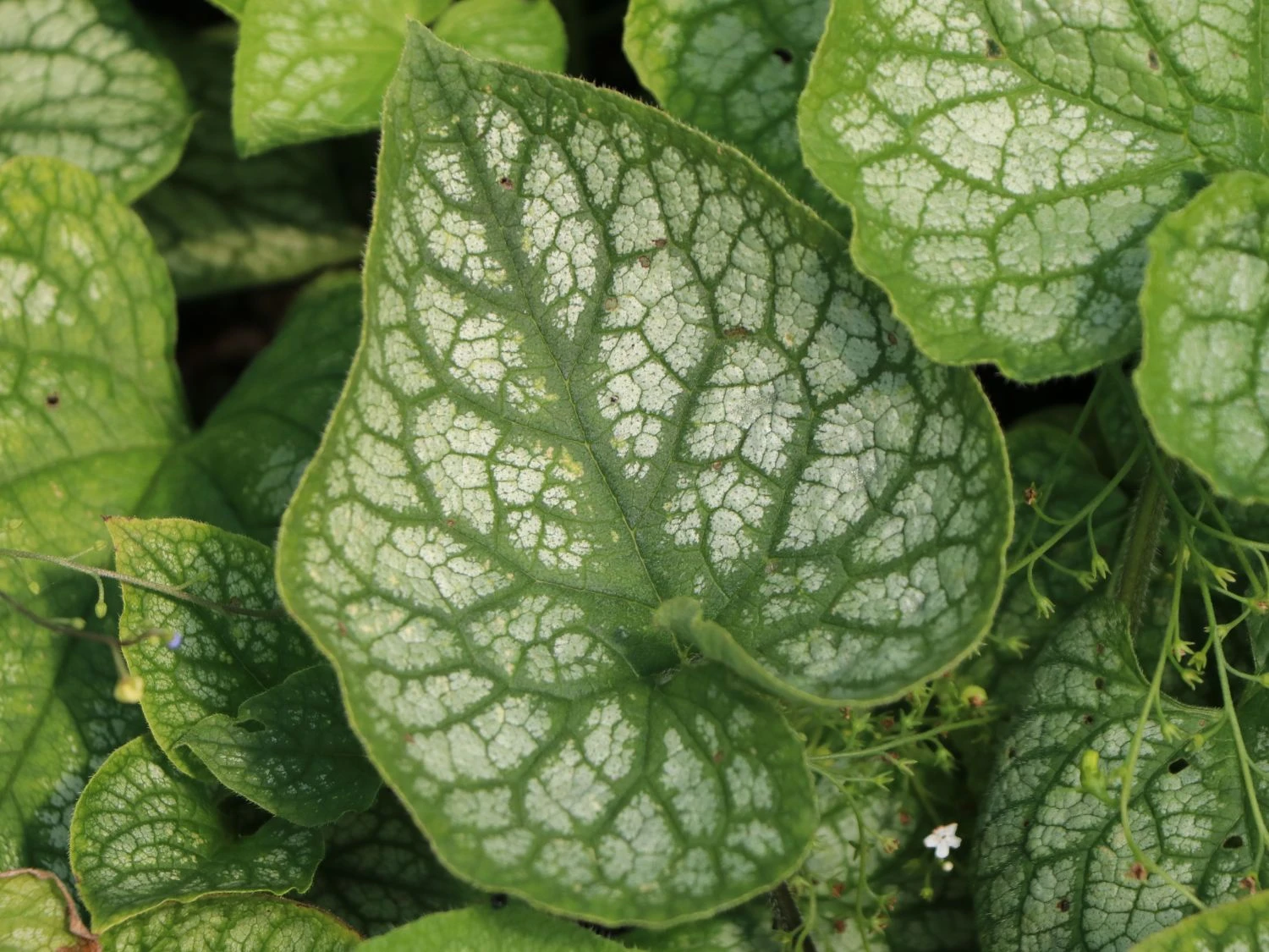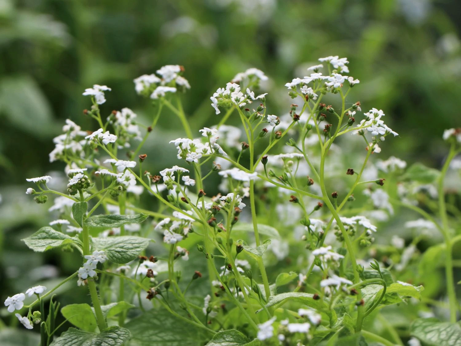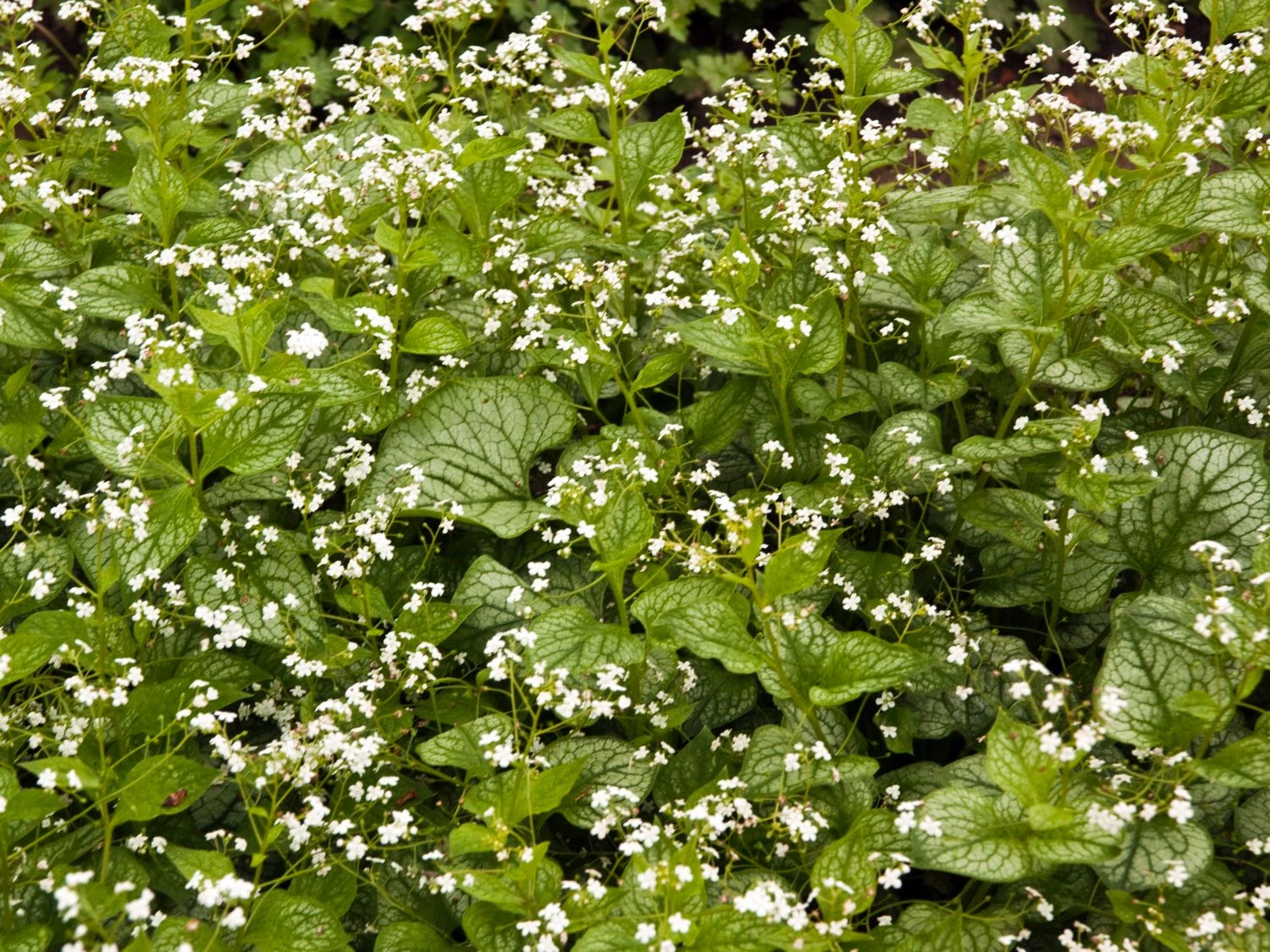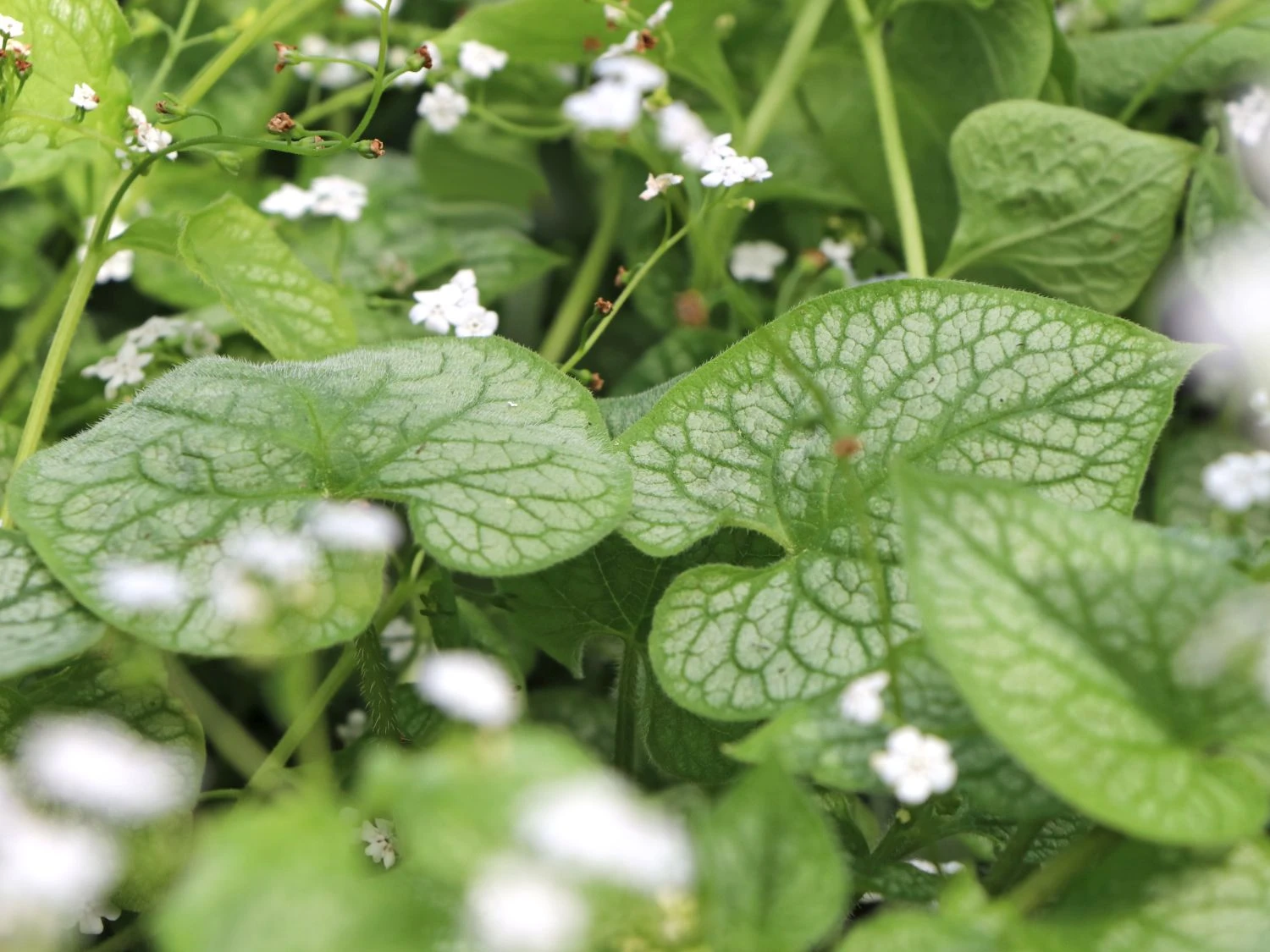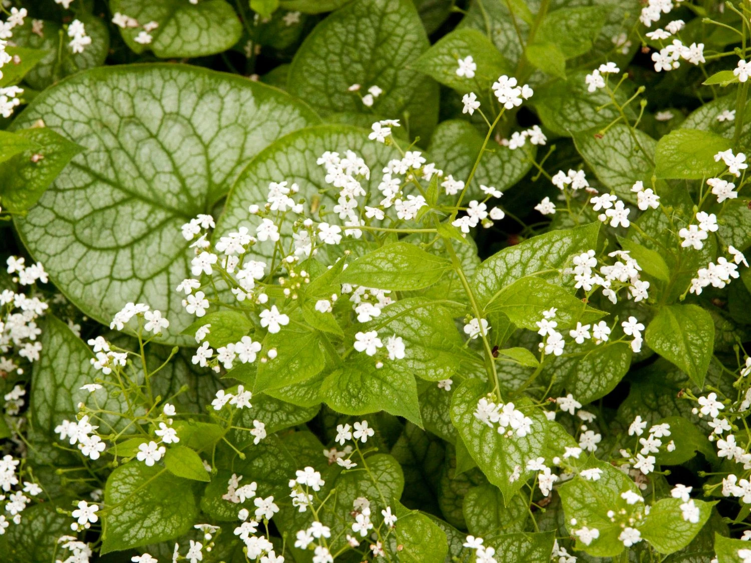 Im Mai erstrahlen die schattigen Gartenplätze in leuchtendem Weiß. Spätestens, wenn diese Blattschmuckstaude mit einem Meer aus schneeweißen Blüten das Frühlingserwachen endgültig einläutet. Sie erscheint mit ihrem ebenmäßig gezeichneten, silbrigen Laub und ihren edlen weißen Blüten. Das Kaukasus-Vergissmeinnicht stammt aus den Wäldern des Kaukasus und gehört zur Gattung Brunnera aus der Familie der Raublattgewächse (Boraginaceae). Brunnera macrophylla ‚Mr Morse‘ ® ist eine Züchtung und eine wertvolle Bereicherung des Brunnera-Sortiments. Als Blattschmuckpflanze erfreut sie sich einer großen Beliebtheit. Das große, herzförmige Blattwerk ist rauh und erscheint erst während der Blüte. Es kommt, bis in den frühen Winter, in halbschattigen Bereichen wirkungsvoll zur Geltung.
