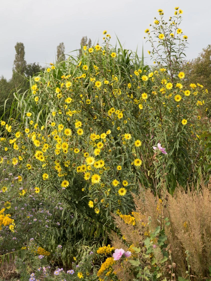 Die Riesen Sonnenblume ‚Simon Wiesenthal‘ ist eine reichblühende und standfeste Sorte. Sie erreicht eine Wuchshöhe von bis zu 220 cm und ist damit ein nicht zu übersehender Akzent in jedem Garten! Die (bot.) Helianthus giganteus ‚Simon Wiesenthal‘ erfreut den Gärtner mit ihren hellgelben Blüten, die wie leuchtende Sonnen an den dunklen Stängeln sitzen. Die Blütezeit der Riesenstaude reicht von August bis in den September. Das macht die Riesen Sonnenblume ‚Simon Wiesenthal‘ zu einer spätblühenden Bienennährpflanze. Auch als Schnittblume überzeugt die Staude. Ihre Blüten sind zwar kleiner als die der einjährigen Sonnenblumen, dafür ist diese Riesensonnenblume mehrjährig und langlebig. Damit sich die Pflanzen dieser Art perfekt entwickeln, benötigen sie einen sonnigen Standort. Die beste Gartenerde hat einen mittleren Nährstoffgehalt und ist gut durchlässig. Die Riesen Sonnenblume ‚Simon Wiesenthal‘ erweist sich als wenig arbeitsintensiv. Sie zieht sich im Spätherbst zur Winterruhe zurück. Der Gartenfreund schneidet die Triebe zum Winter oder im zeitigen Frühjahr bis in Bodennähe ab. Die Staude ist gut winterhart und treibt im Frühjahr zuverlässig und kraftvoll aus.
