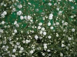 Das Gefülltblühende Schleierkraut ‚Bristol Fairy‘ schmückt sich mit unzähligen, schneeweißen, kleinen, gefüllten Blüten. Die (bot.) Gypsophila paniculata ‚Bristol Fairy‘ dekoriert sich im Juli mit zierlichen Blütenköpfen. Als hätte jemand massenhaft weiße Blütenblätter über einem grünen, hochflorigen Teppich ausgegossen. Die schöne Pflanze ist auch als Rispiges Gipskraut bekannt. Die Blütenwolken scheinen im Sommerwind ständig in Bewegung zu sein und ergeben einen anmutigen Anblick. Das leuchtende Weiß der Blütenblätter bildet einen wundervollen Gegensatz zum graugrünen Laub. Die grazilen Blüten, die Gypsophila paniculata ‚Bristol Fairy‘ einen zerbrechlichen Eindruck verleihen, ergeben einen bemerkenswerten Kontrast zu den derben, bereiften Blättern. Bis in den August schickt die Staude zahllose Blüten nach. Das Gefülltblühende Schleierkraut ‚Bristol Fairy‘ ist eine Bereicherung für Beete und Rabatten.