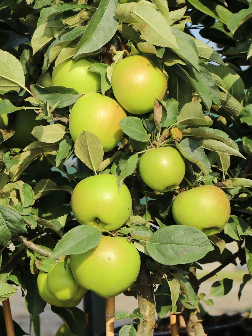 Der Säulenapfel Ballerina ‚Bolero‘ ® trägt herrlich grüne Früchte mit einem fein säuerlichen Geschmack. Die Äpfel wachsen zu einer mittleren Größe heran und nehmen zur Erntezeit grüngelbe Töne an. Ein Biss in das feste, saftige Fruchtfleisch ist das pure Vergnügen. Ihr Geschmack erinnert an den säuerlichen ‚James Grieve‘ mit seinem zarten Apfelaromen. Ab Ende August beginnt die Ernte der vitaminreichen Früchte. Der (bot.) Malus Ballerina ‚Bolero‘ ® wächst schlank und nimmt wenig Platz ein. Er erreicht eine Höhe von maximal 300 Zentimetern und dehnt sich gerade einmal auf eine Breite von 50 Zentimetern aus. Das platzsparende Gehölz ist perfekt für alle, die wenig Platz haben und eigenes Obst ziehen wollen. An dem kräftigen Mitteltrieb bilden sich viele kurze Seitenäste. Blüten und Früchte wachsen am seitlichen Fruchtholz und sind kinderleicht zu ernten. Der zierliche Obstbaum wächst problemlos in einem Kübel und benötigt wenig Pflege. Das perfekte Obst für Gartenneulinge! Der Säulenapfel Ballerina ‚Bolero‘ ® gilt als zertifiziert virusfrei. Ein gesunder und widerstandsfähiger Apfelbaum erspart den Einsatz aufwendiger Pestizide.