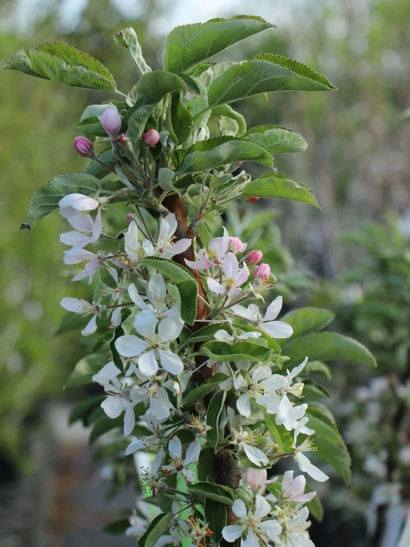 Ende April bilden sich an den seitlichen Triebspitzen des Säulenapfels Ballerina ‚Bolero‘ ® zahlreiche rosa Knospen. Die weißen Blüten sitzen in Büscheln zwischen dem dichten Blattwerk. Den Ertrag steigert eine andere Befruchtersorte in der Nähe. Ein Säulenapfel einer anderen Sorte direkt neben den Malus Ballerina ‚Bolero‘ ® platziert, löst das Problem. Bienen und Hummeln lieben Apfelblüten und tragen die Pollen von Baum zu Baum. Der Säulenapfel Ballerina ‚Bolero‘ ® fühlt sich in einem großen Kübel wohl. Hier kann er fünf Jahre wachsen. Äpfel lieben einen humusreichen, durchlässigen Boden, der einen guten Wasserabzug bietet. Gerade in den Sommermonaten, wenn die Äpfel reifen, benötigt ein Säulenapfel in einer Kübelkultur viel zusätzliches Wasser. Wegen geringen Blattmasse ist eine ausreichende Zufuhr von Nährstoffen wichtig. Dem Gießwasser alle zwei Wochen Flüssigdünger beizugeben, bewirkt wahre Wunder.
