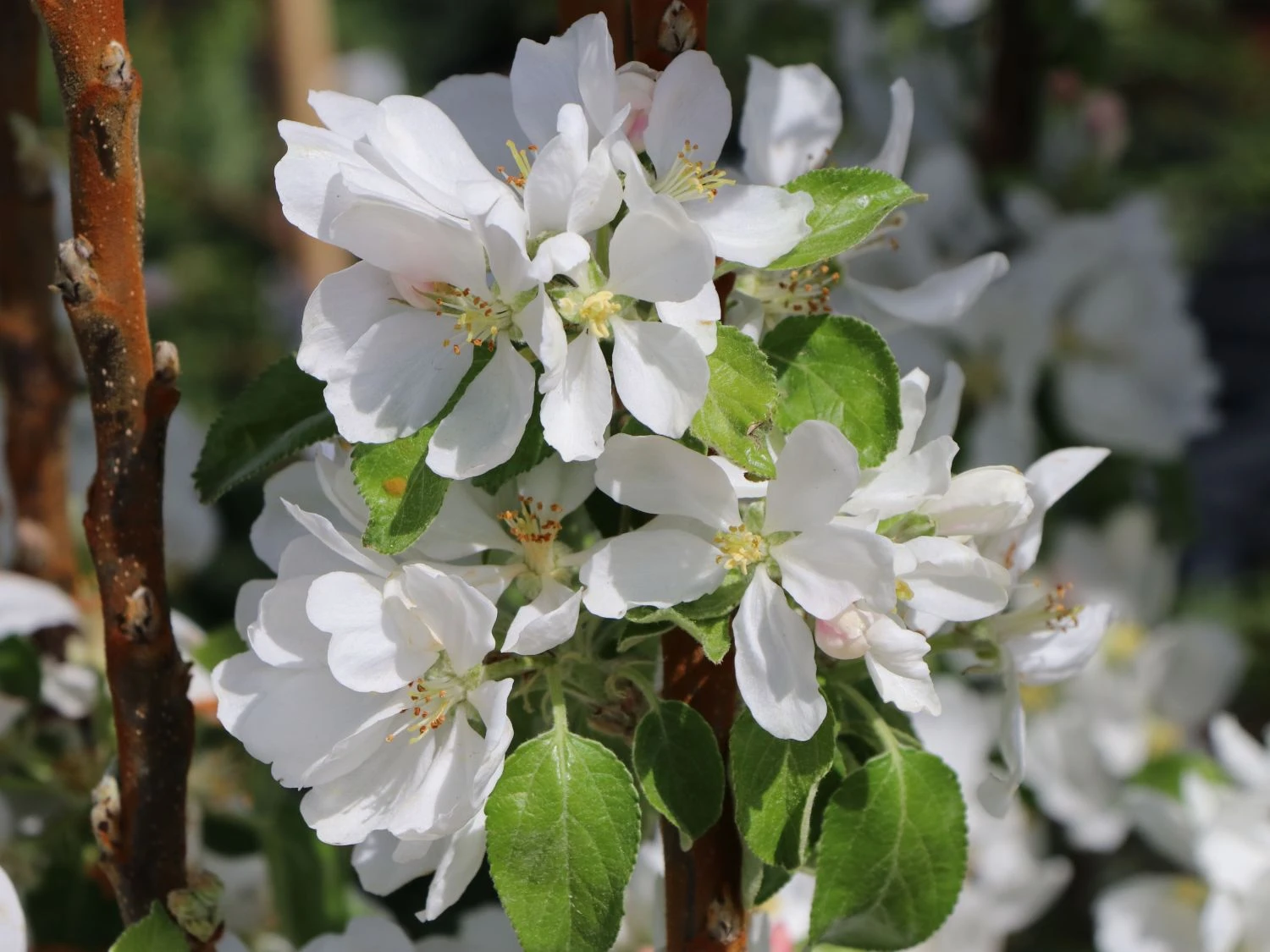 Schon lange vor den Früchten begeistert der Malus Ballerina ‚Flamenco‘ ® mit seinen wundervollen Blüten. Diese zeigen sich im Frühjahr und wecken Vorfreude auf die Früchte. Ihr Anblick erfreut den Gärtner und sie sind bei Bienen und Hummeln beliebt. Die possierlichen Insekten fliegen die einfachen Blüten gerne an. Nach der Blütezeit steht das schöne Laub des Säulenapfels Ballerina ‚Flamenco‘ ® im Vordergrund. Es zeigt sich in einem frischen Mittelgrün. Die Blätter sind ellipsenförmig und vor gespitzt, sie haben einen gezähnten Rand und eine deutliche Nervatur. Das zierliche Gehölz gleicht derart belaubt einer grünen Säule. Eine ausladende Krone, wie andere Apfelbäume sie zeigen, findet sich an dieser Kulturform des Apfels nicht. Dieses Bäumchen wächst schlank aufrecht auf eine Wuchshöhe zwischen zwei und drei Metern. Dabei nimmt es in der Breite gerade 30 bis 50 Zentimeter ein! Säulenobst ist optimal für alle, die kleine Gärten ihr Eigen nennen. Oder für Obstfreunde, denen kein grünes Reich vergönnt ist. Mit ‚Flamenco‘ ® brauchen sie nicht länger auf eigene Äpfel verzichten. Der Obstbaum findet ausreichend Platz auf der Terrasse oder dem Balkon und lässt sich problemlos im Kübel halten.