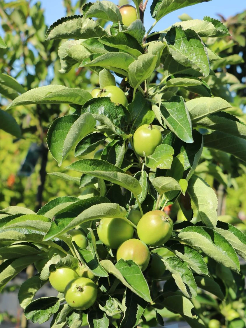 Im Frühjahr präsentiert er sich in einem hellrosa-weißen Blütenkleid, das herrlich duftet. Seinen besten Schmuck legt er im Herbst an. Pralle, große Äpfel in einem leuchtenden Gelborange. Auf der Sonnenseite schmücken sie sich mit roten Bäckchen! Das leckere Fruchtfleisch ist cremeweiß und fest. Am Gaumen zeigt es sich erfrischend saftig, abgerundet von einer milden Säure. Der Säulenapfel ‚Fire Dance‘ ® begeistert mit hohen, früh einsetzenden Erträgen. Dank seiner geringen Größe und der schmalen, säulenartigen Wuchsform beschenkt er auch Besitzer kleiner Gärten mit frischem Obst und gedeiht sogar auf dem Balkon. Er ist frosthart und unempfindlicher gegenüber Krankheiten. Malus ‚Fire Dance‘ ® schmückt sich mit eiförmigen Blättern, die einen gesägten Rand aufweisen. Sie sind mittelgrün gefärbt. Im April entfalten sich die ersten hellrosa-weiß schimmernden Blüten, die den Gartenbesitzer bis Mai erfreuen. Diese Pracht ist ein märchenhafter Anblick. Die Blüten verströmen einen angenehmen Duft und ziehen Scharen von Bienen und Hummeln an. Ab Ende September beginnt die Erntezeit für die schmackhaften Äpfel, die sich aus den Blüten entwickeln. Der Säulenapfel ‚Fire Dance‘ ® wächst straff aufrecht und bildet eine zauberhafte, schlanke Säulenform aus. Seine Höhe liegt zwischen 200 und 300 Zentimetern, die Breite beträgt 30 bis 50 Zentimeter. Jedes Jahr legt er 10 bis 30 Zentimeter zu.