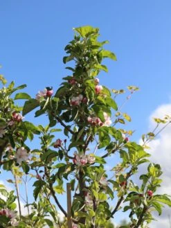 Ende April blüht der Säulenapfel ‚Greencats‘ mit weiß-rosa Blüten. Wie alle Apfelbäume benötigt er andere Befruchtersorten in der Nähe. Hierzu eignen sich andere Säulenapfelsorten wie ‚Goldcats‘ und ‚Redcats‘ oder Apfelbäume in der Nachbarschaft. So zierlich das Obstgehölz wirkt, ist sein Wesen robust und gesund. Diese Apfelsorte ist gegen die häufigsten Pilzkrankschäden immun. Ein aufwändiger Einsatz von Pestiziden entfällt bei der Kultur des Malus ‚Greencats‘ ®. An einem sonnigen bis halbschattigen Platz findet diese Apfelsorte beste Grundlagen für eine gute, reiche Ernte. Apfelbäume lieben einen frischen, tiefgründigen Boden mit einem guten Humusanteil. Eine gute Bodenqualität wirkt sich immer positiv auf das Wachstum und den Ernteertrag aus. Wird der Säulenapfel ‚Greencats‘ in einem Kübel kultiviert, ist im Sommer eine regelmäßige Kontrolle der Bodenfeuchte notwendig. Wasser ist für einen Apfelbaum lebensnotwendig. Der Baum hält seine schlanke Form auch ohne Rückschnitt.