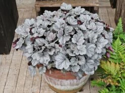 Das Purpurglöckchen ‚Silver Gumdrop‘ begeistert mit seinem außergewöhnlich schönen Blattschmuck und den grazilen, leuchtenden Blüten. Seine Blätter sind herzförmig, leicht gewellt und weisen einen gelappten Blattrand auf. Im Frühjahr zeigen sie ein seidenmattes Weißgrau, sind mit einem silbrigen Schimmer überhaucht und besitzen auffallend dunkle Blattadern. Während der Sommermonate färbt sich das Laub allmählich dunkler und präsentiert sich schließlich rosa bis purpurfarben. Der attraktive Silberschimmer bleibt dabei erhalten. Da die Blätter wintergrün sind, sorgen sie auch in der vegetationsarmen Jahreszeit für dekorative Farbtupfer im Garten. Von Juni bis August erfreut Heuchera villosa ‚Silver Gumdrop‘ das Auge mit unzähligen kleinen, glockenförmigen Blüten. Diese erscheinen in leuchtendem Rosa und harmonieren perfekt mit der Blattfarbe. Sie sind eine wichtige Nahrungsquelle für Bienen und andere Insekten. Das Purpurglöckchen ‚Silver Gumdrop‘ wächst horstig, buschig, niedrig und kompakt. Es bildet aufrechte, filigrane Blütenstiele aus. Seine Höhe liegt zwischen 15 und 30 Zentimeter, in der Breite erreichst es zwischen 20 bis 30 Zentimeter.