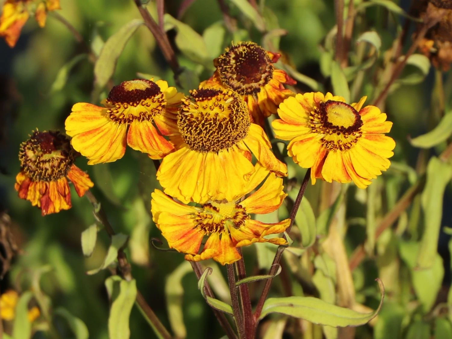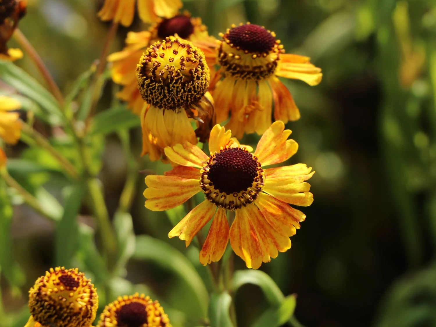 Die Sonnenbraut ‚Peach Sundae‘ verführt im späten Sommer und bis weit in den Herbst hinein mit ihren farbintensiven Blüten. Die Blütenblätter sind in einem warmen Rostrot und schmücken sich mit gelben Spitzen. Ein herrlicher Anblick, der auch Schmetterlinge, Bienen und Hummeln nicht kalt lässt. In der Zeit von Juli bis September zeigen sich die schönen Blüten über den sommergrünen Blättern. Der Wuchs von (bot.) Helenium x cultorum ‚Peach Sundae‘ ist horstig und erreicht eine durchschnittliche Höhe von rund 60 Zentimeter sowie eine Breite von 30 bis 40 Zentimeter. Die sonnenhungrige Sonnenbraut ‚Peach Sundae‘ liebt einen vollsonnigen Standort und einen lockeren, frischen bis feuchten, nährstoffreichen sowie gut durchlässigen Gartenboden. Hier entwickelt sie sich zu voller Pracht und begeistert mit ihren kräftig gefärbten Blüten.