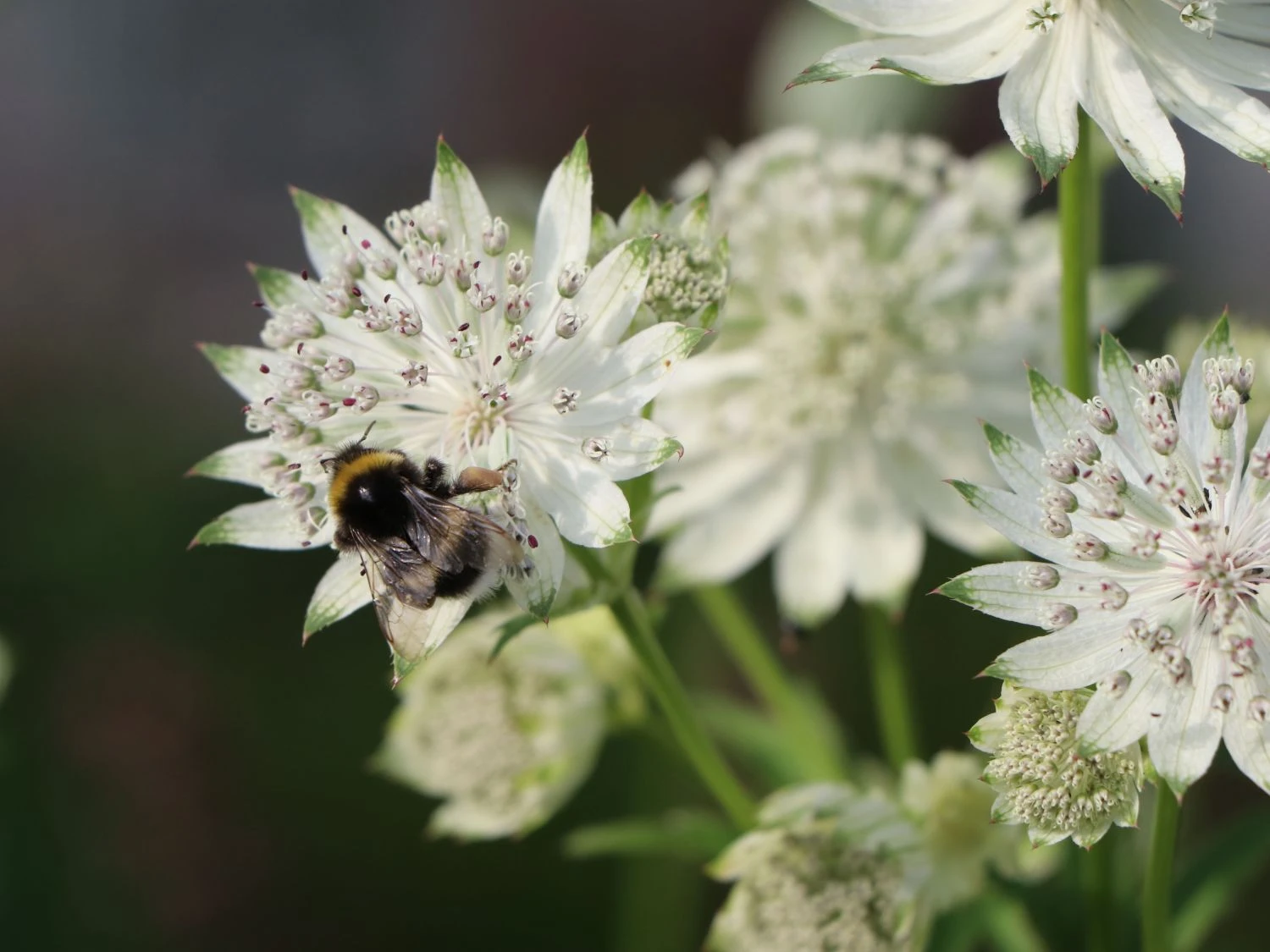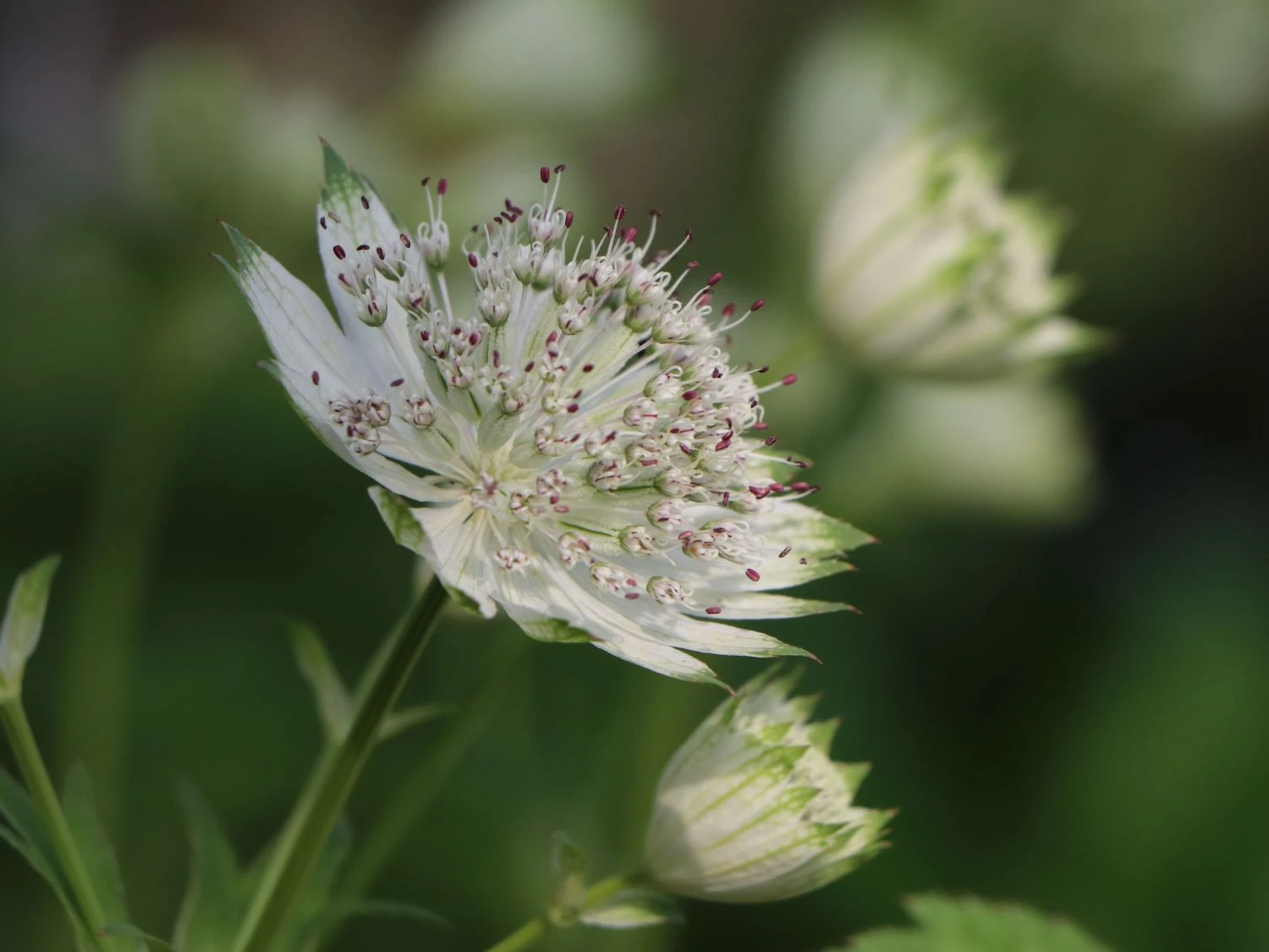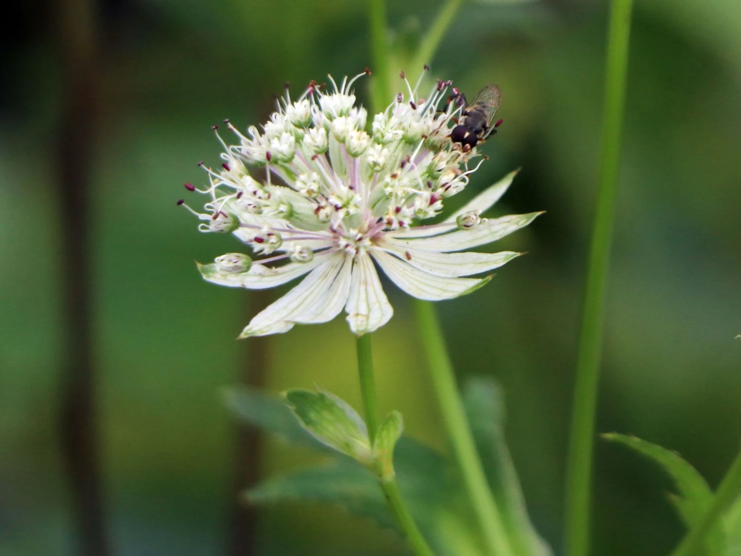 Die hohen, aufrechten Stängel erinnern bereits an heraufragende Türme, was auch nicht ganz falsch ist, denn diese Staude wächst und gedeiht in nahezu ganz Europa, und das auch in Bergregionen von bis zu 2000 Metern Höhe. An einen Turm erinnert auch der Stängel: Senkrecht emporsteigend besitzt er nur wenige Blätter, und die oben aufgesetzten Blüten wirken wie viele kleine helle Turmspitzen. Der Stängel ist wie für eine Staude typisch eher krautig als holzig oder grasähnlich. Die schlichte Schönheit dieser Blume brachte sie dann aus den Bergen der Alpen in die Gärten vieler Menschen. Dort gedeiht die Große Sternendolde zumeist in Blumenbeeten oder in Staudenkästen. Ein Trumpf der Astrantia major ‚Star of Royals‘ ®: Sie ist vor Schnecken befreit.