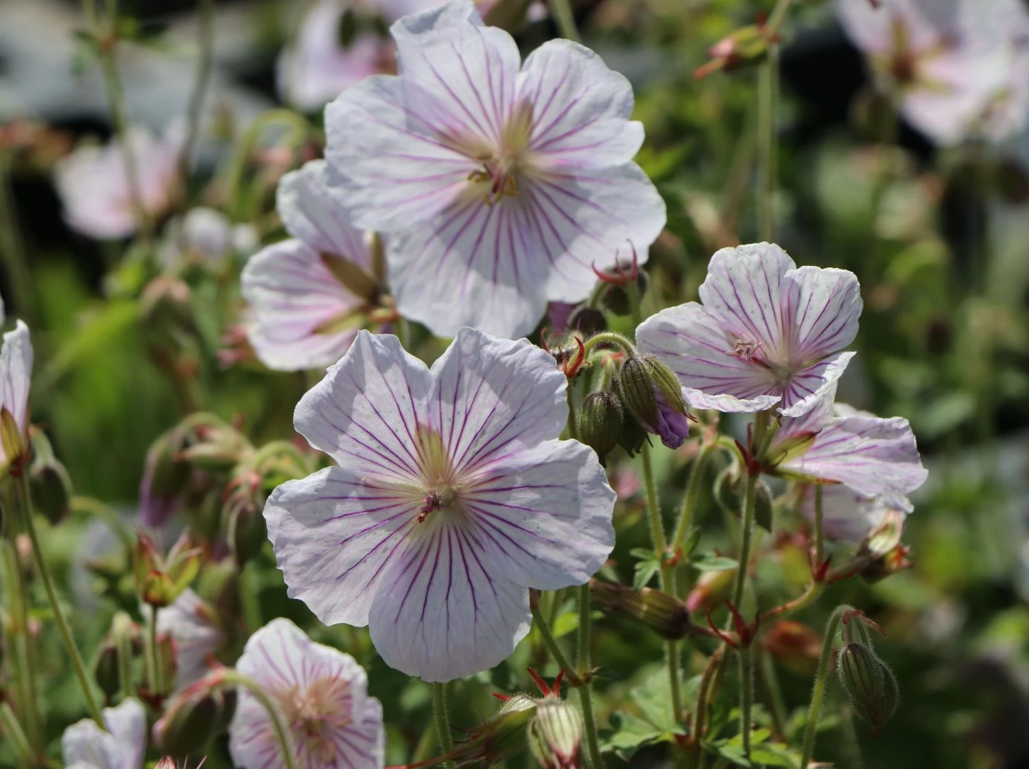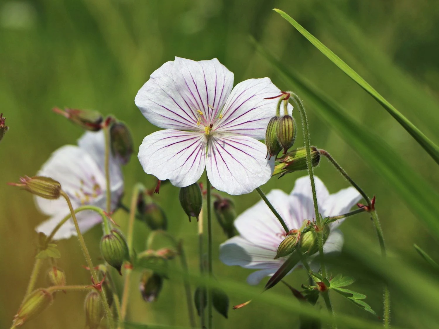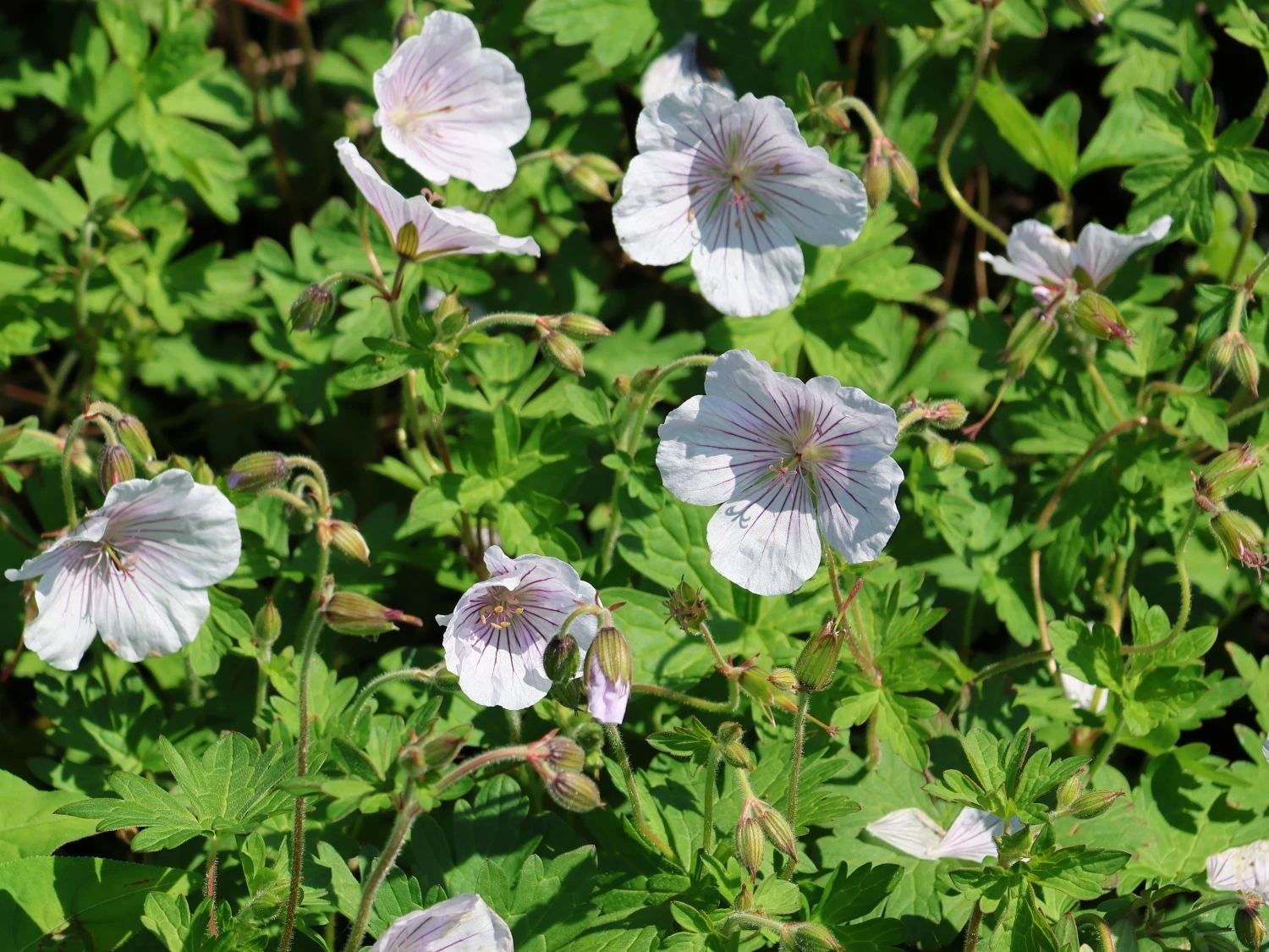 Der Himalaja-Storchschnabel ‚Derrick Cook‘ überzeugt durch seine einfache und filigrane Blüte. Die weißen Kronblätter sind violett geadert und wirken dadurch sehr zart. Die dunkelgrünen und tief eingeschnittenen Blätter bilden einen wunderschönen Kontrast zu den leuchtenden Blütenblättern. Schneidet man die vielblütige Pflanze nach der ersten Blühphase zurück, kann man sich im Herbst häufig erneut an den Blüten dieser Geranium-Sorte erfreuen.