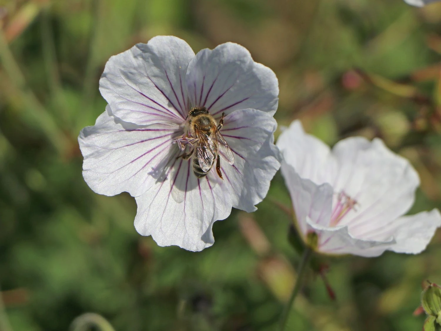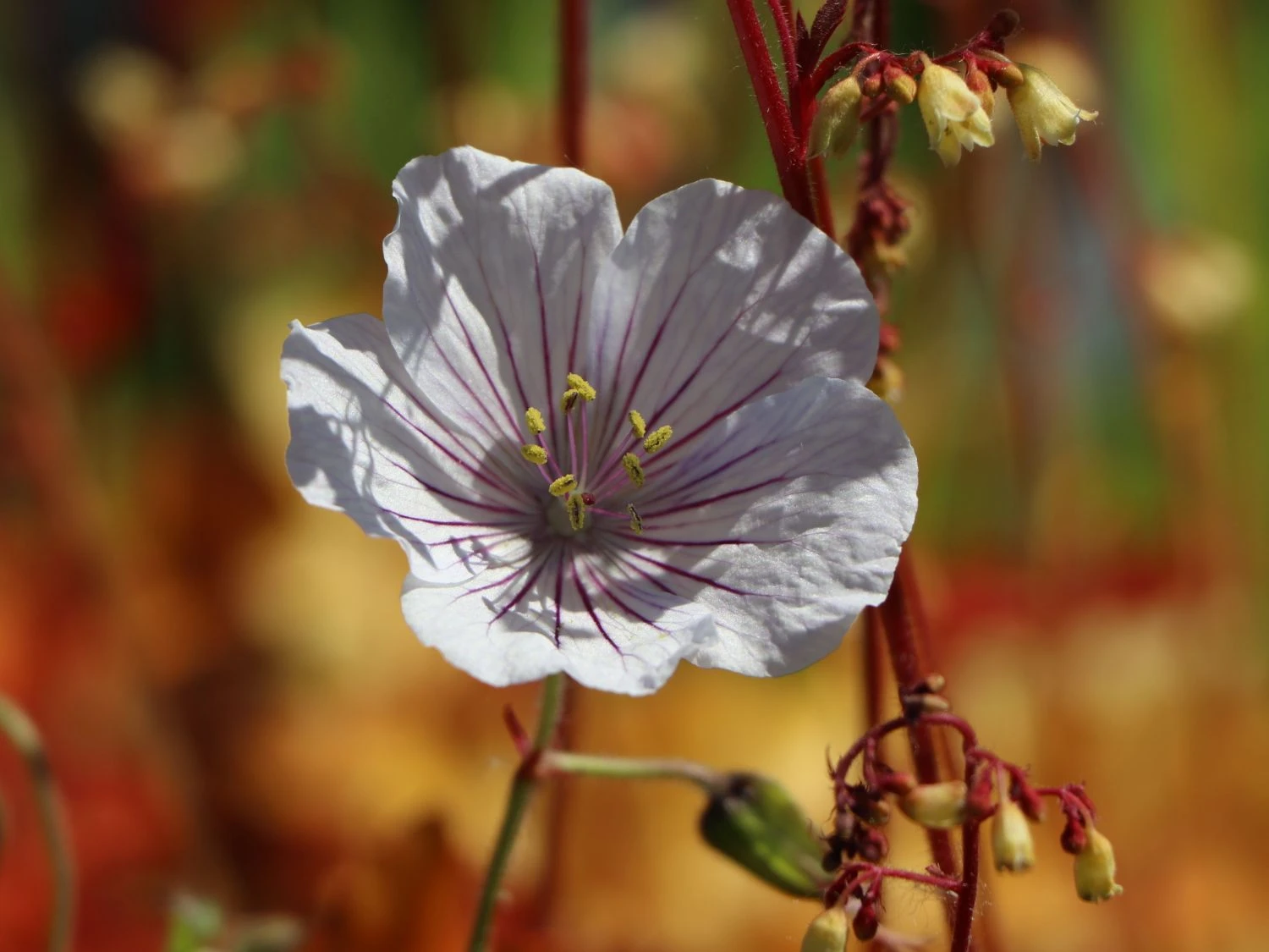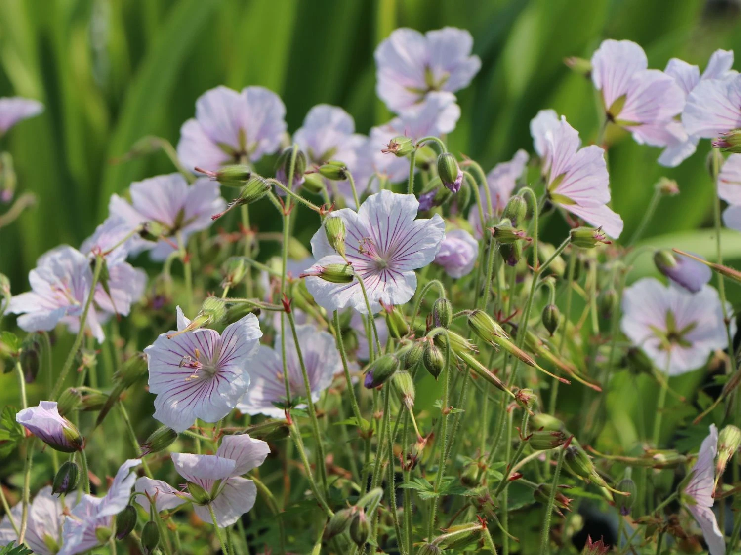 Der Himalaja-Storchschnabel ‚Derrick Cook‘ überzeugt durch seine einfache und filigrane Blüte. Die weißen Kronblätter sind violett geadert und wirken dadurch sehr zart. Die dunkelgrünen und tief eingeschnittenen Blätter bilden einen wunderschönen Kontrast zu den leuchtenden Blütenblättern. Schneidet man die vielblütige Pflanze nach der ersten Blühphase zurück, kann man sich im Herbst häufig erneut an den Blüten dieser Geranium-Sorte erfreuen.