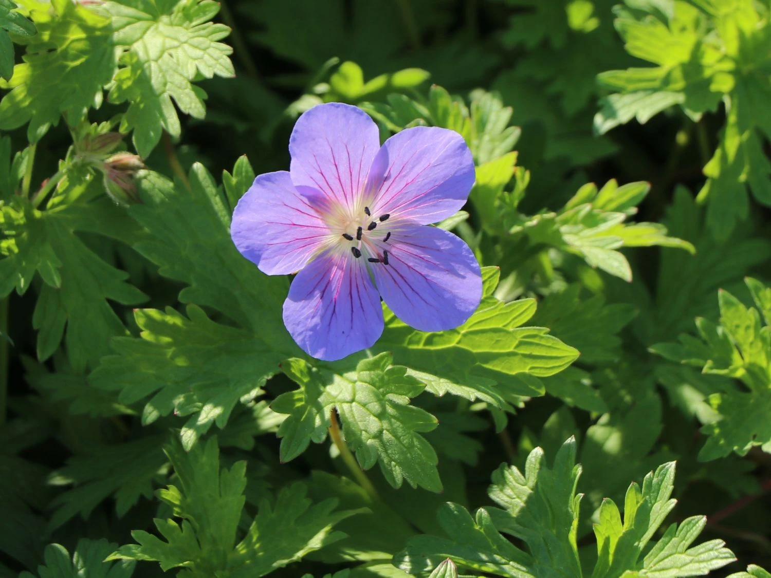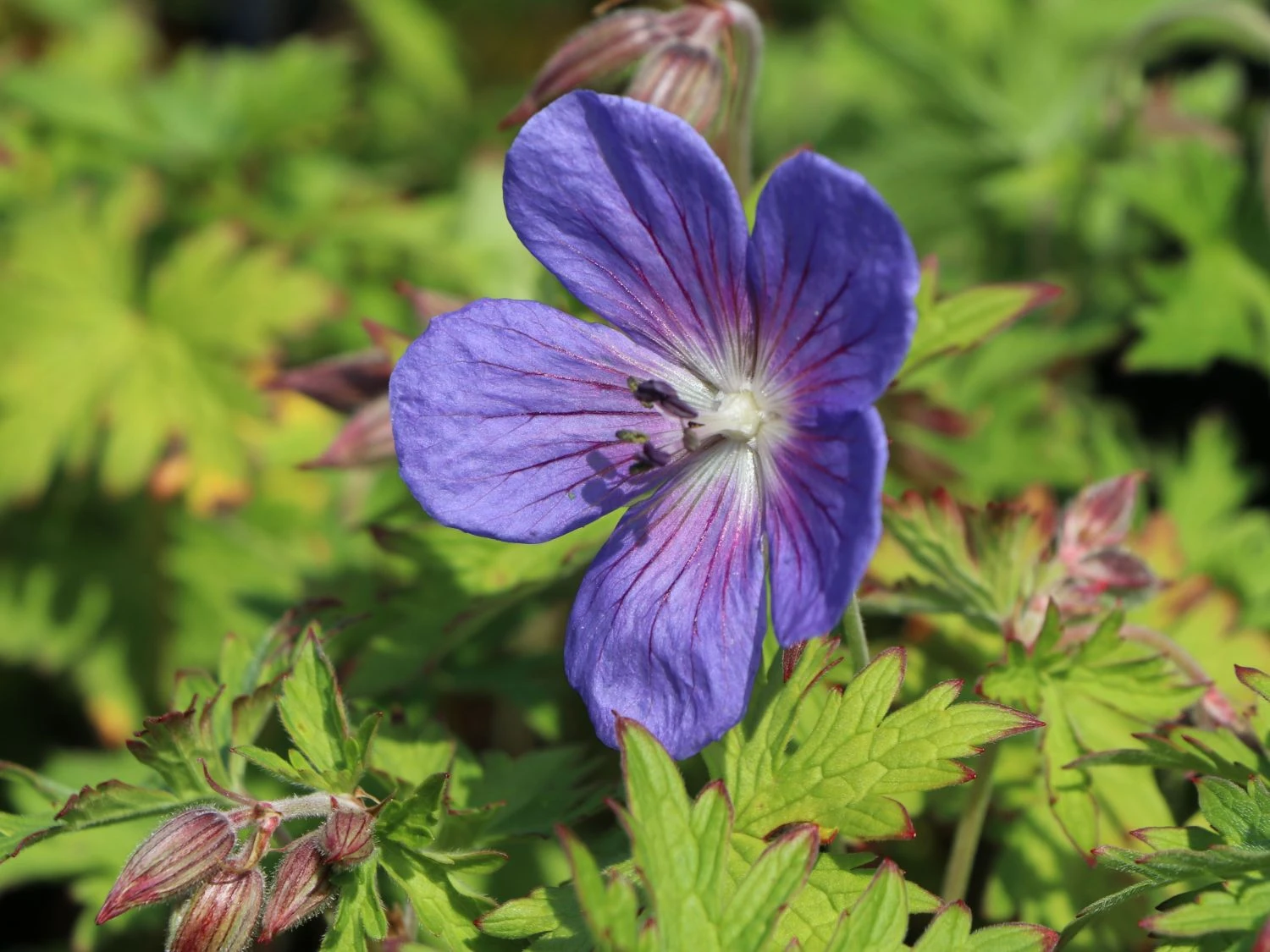 Der Storchschnabel ‚Johnsons Blue‘ ist ein praktischer Bodendecker mit intensiv leuchtenden Blüten in Violettblau. Es handelt sich um eine blühfreudige englische Sorte aus dem Jahr 1950. (Bot.) Geranium pratense ‚Johnsons Blue‘ ist eine dauerblühende Staude, die sich von Juni bis August von ihrer besten Seite zeigt. Die blauen Blüten sind rot geädert. Die schalenförmigen Blüten erreichen zwischen 5 bis 10 cm im Durchmesser. Die Farbbrillanz von ‚Johnsons Blue‘ ist überwältigend. Die grünen Laubblätter bilden einen schönen Kontrast zu den blauen Blüten. Die Blätter sind tief gelappt, schmal und spitz. Die Blüten sitzen an verzweigen, langen, dünnen Stielen und sind beliebtes Ausflugsziel von Bienen und Hummeln. Der Storchschnabel ‚Johnsons Blue‘ verleiht jedem Standort ein verspielt-romantisches Flair. Die Pflanze erreicht eine Wuchshöhe von bis zu 60 Zentimeter. Sie schmückt Beete, Freiflächen, Gehölzränder oder Pflanztröge. ‚Johnsons Blue‘ ist unkompliziert und schnittfest. Nach der Blüte eingekürzte Triebe sorgen für einen erneuten Austrieb.