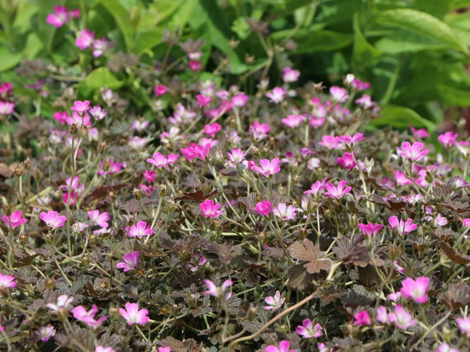 Bis in den Oktober hinein begeistern die Blüten des Storchschnabels ‚Orkney Cherry‘ mit ihrer hellrosa Pracht. Die schalenförmigen Blüten sind bis zu zwei Zentimeter groß. Ihre fünf Blütenblätter umschließen die lichte Blütenmitte mit den grazilen Staubgefäßen. Die Blütenblätter sind leicht geädert. Bienen, Hummeln und Schmetterlinge lassen sich gern zur Nahrungssuche auf den Blüten nieder. Auf Freiflächen und am Gehölzrand ist Geranium x oxonianum ‚Orkney Cherry‘ ein optimaler Bodendecker und begrenzt Beete und Rabatten. Vor Gehölzen wirkt das bronzefarbene Laub und die hellrosa Blüten hervorragend. Der Oxford-Storchschnabel ziert Steinanlagen und Mauerkronen. Hier gesellt er sich zu filigranen Gräsern, Alchemilla oder Mauerpfeffer. Dank seiner natürlichen Schönheit ist der Storchschnabel ‚Orkney Cherry‘ die ideale Staude für naturnahe Wiesen, wo er in Gemeinschaft mit Mohn und Margeriten blüht. In Balkonkästen und Kübeln ziert er den Balkon, die Terrasse und den Eingangsbereich.