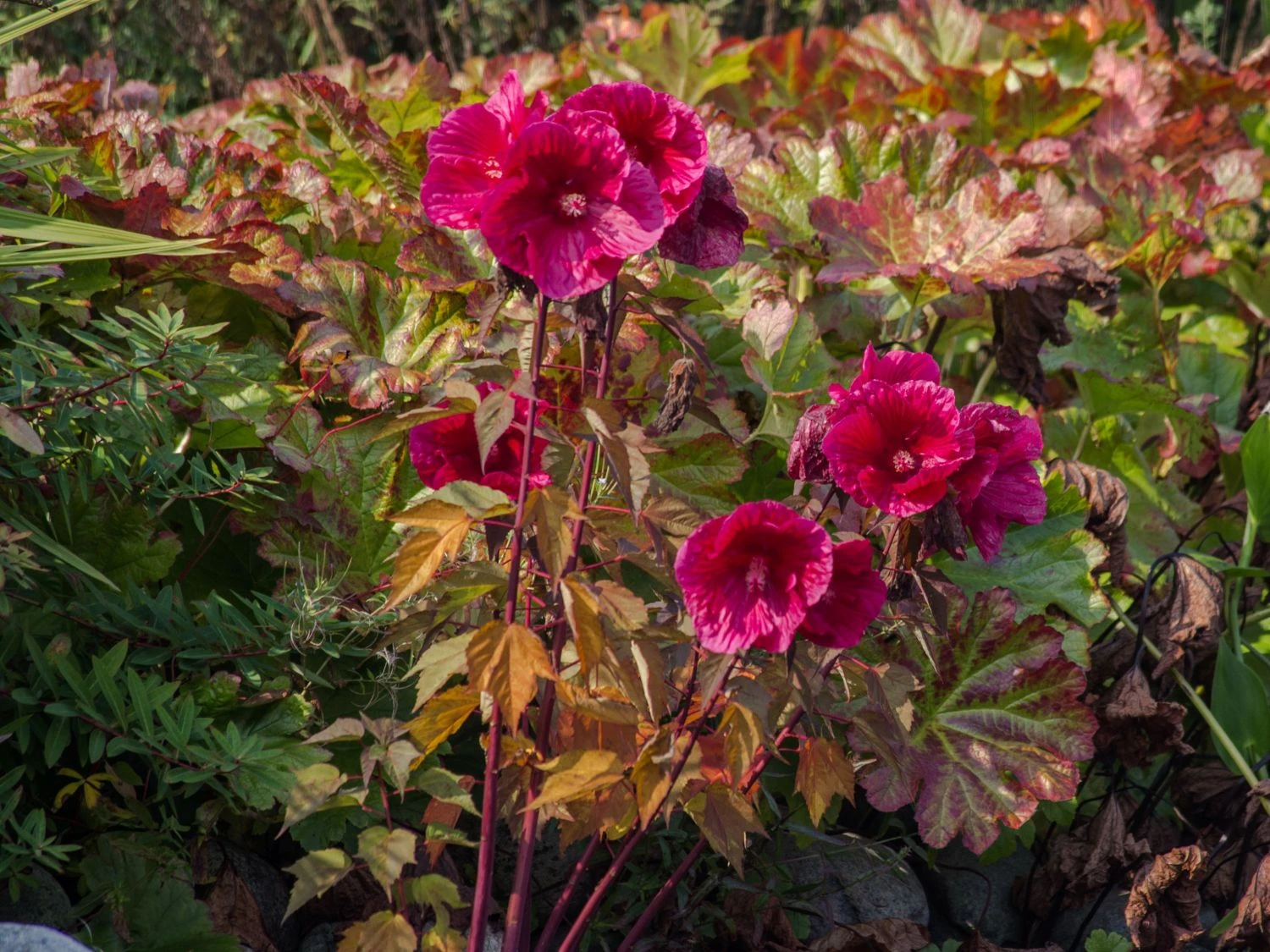 Die Pflanze ist anspruchslos und unkompliziert. Dem Gärtner macht der Sumpfeibisch wenig Arbeit! Die beste Pflanzzeit ist der Frühling oder der Herbst. Beim Pflanzen ist darauf zu achten, das Pflanzloch in doppelter Größe und Breite des Wurzelballens auszuheben. Dadurch lässt sich die Verdichtung der Gartenerde verhindern. Da die Pflanze nicht verholzt, sterben im Winter die oberirdischen Triebe bei allen Hibiscus-moscheutos-Sorten mit dem ersten Frost komplett ab. Der sorgsame Gärtner entfernt die toten Triebe. Bis zu -11 C° ist die Staude winterhart. Während starker Frostperioden schützt der Pflanzenfreund den Bereich oberhalb der Wurzeln mit Reisig oder Mulch. Der Hibiscus moscheutos Planet Griotte ‚Tangri‘ bedankt sich im Frühling mit einem frischen Austrieb und wundervollen Blüten im Sommer.