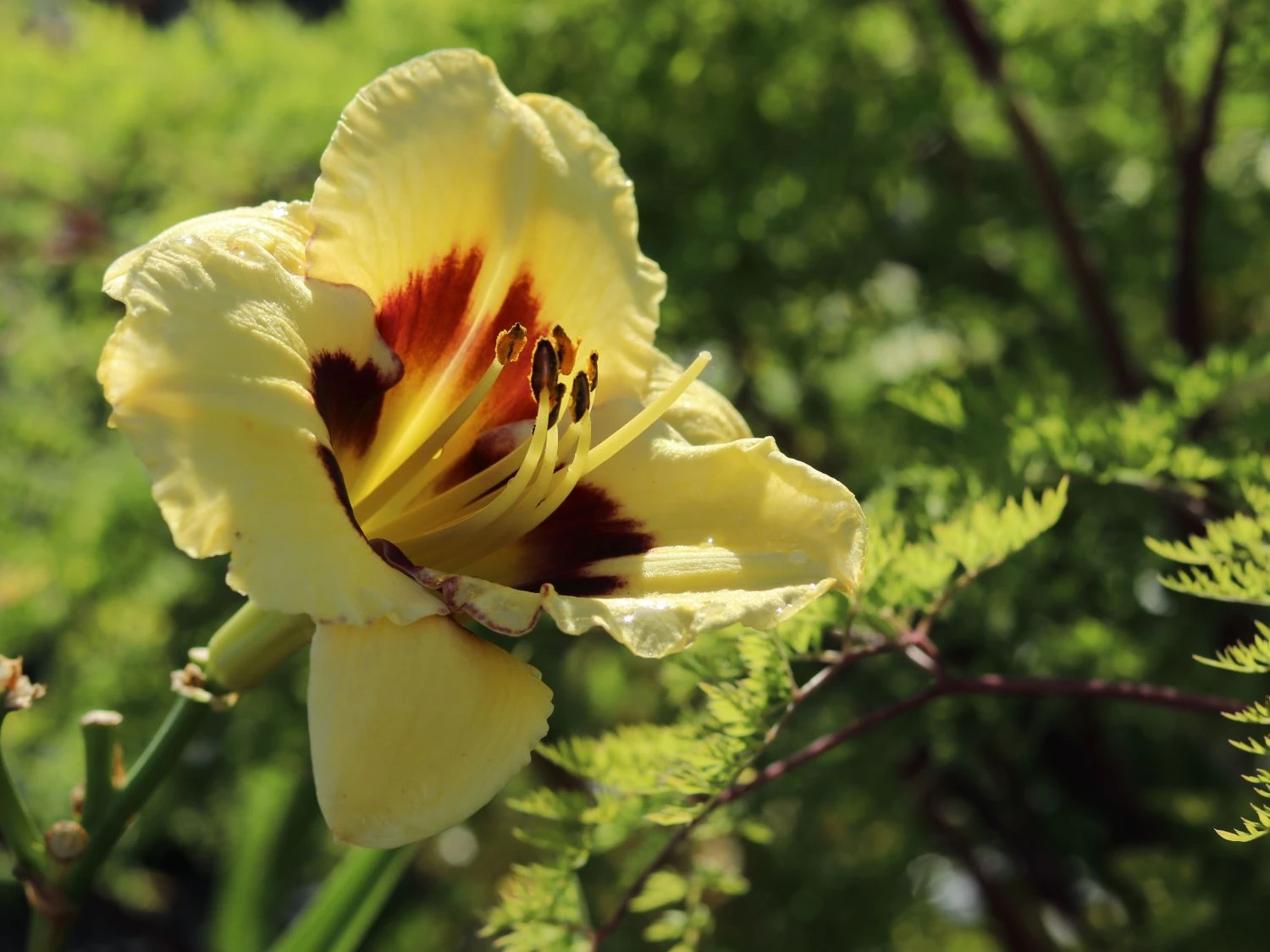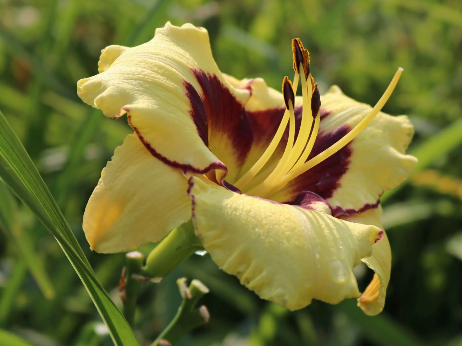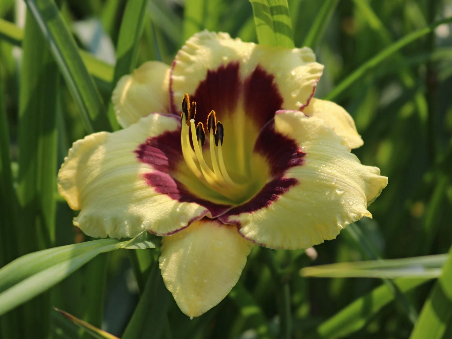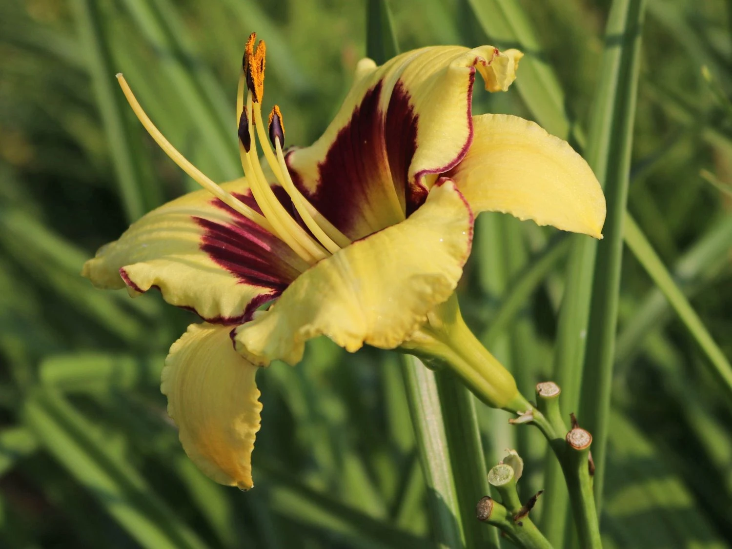 Die Taglilie ‚El Desperado‘ trägt einen verwegenen Sortnennamen. Sie schmückt sich mit außergewöhnlicher Blütenfarbe. Ihre trichterförmigen Blüten sind in ein helles Gelb getaucht. Ihre besondere Anziehungskraft entfalten sie aufgrund der purpurnen Mitte. Auch die Ränder der einzelnen Blütenblätter zieren sich mit diesem attraktiven Farbton. So effektvoll blüht kaum eine andere Staude im Garten! In einem Staudenbeet setzt die (bot.) Hemerocallis x cultorum ‚El Desperado‘ einen glanzvollen Akzent. Besonders, wenn diese Sorte in Gruppen gepflanzt ist, entstehen traumhafte Bilder. Bis zu vier Pflanzen finden pro Quadratmeter ihren Platz. Ein Pflanzabstand von 60 cm ist ausreichend. Die Gartenpflanze erreicht eine gute Wuchshöhe von bis zu 70 Zentimeter und überragt Bodendeckerstauden zu ihren Füßen. Ein Einsatz im mittleren Bereich des Gartenbeets oder im Hintergrund eines Arrangements ist vorteilhaft.