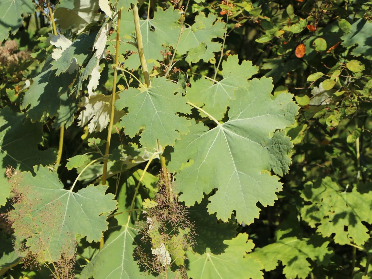 Auffallender bei dieser Großstaude sind da schon die graugrünen, rundlichen und gelappten Blätter der sommergrünen Belaubung.
