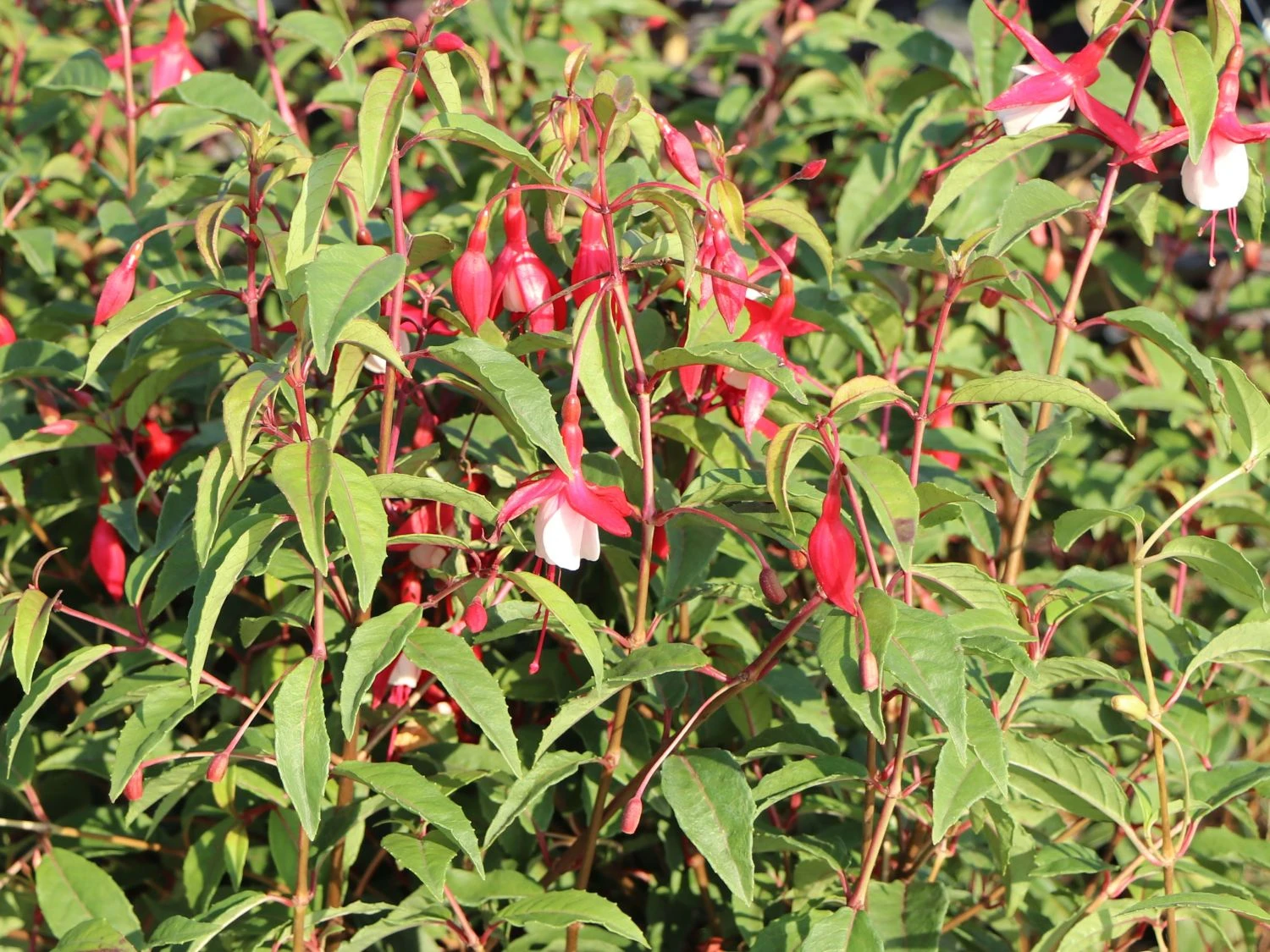 Die Winterharte Fuchsie ‚Madame Cornelissen‘ bringt exotisches Flair in den Garten. Über sattgrünen Blättern zeigen sich eine große Anzahl nickender, roter Blüten mit weißer Mitte. Diese Pflanze zeichnet sich durch eine lange Blütezeit aus und lässt sich vielseitig einsetzen. Verschattete Flächen blühen mit dem kleinen Strauch auf. Die (bot.) Fuchsia Hybride ‚Madame Cornelissen‘ gibt unbeachteten Standorten vor Hecken und Gehölzrändern ein freundliches Gesicht. Auch große Blumenkästen und Kübel bieten ausreichend Platz für diese Fuchsie. Diese Sorte ist eine gelungene Kreation von Égide Norbert Cornelissen aus Belgien und bewährt sich seit 1860. Die Pflanze hat eiförmige bis lanzettliche Blätter, die mit kurzem Stiel an dünnen Ästen sitzen. Die Blüte der Winterharten Fuchsie ‚Madame Cornelissen‘ präsentiert vier Kronblätter in leuchtendem Rot. Im Inneren enthält die Blüte zwei Reihen weiße Kelchblätter. Staubblätter und ein langer Griffel überragen den Kelch und setzen sich kontrastreich in leuchtendem Pink und Rot ab.