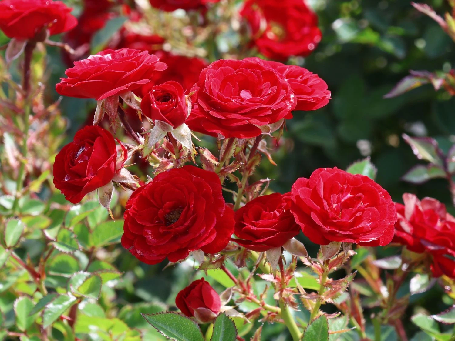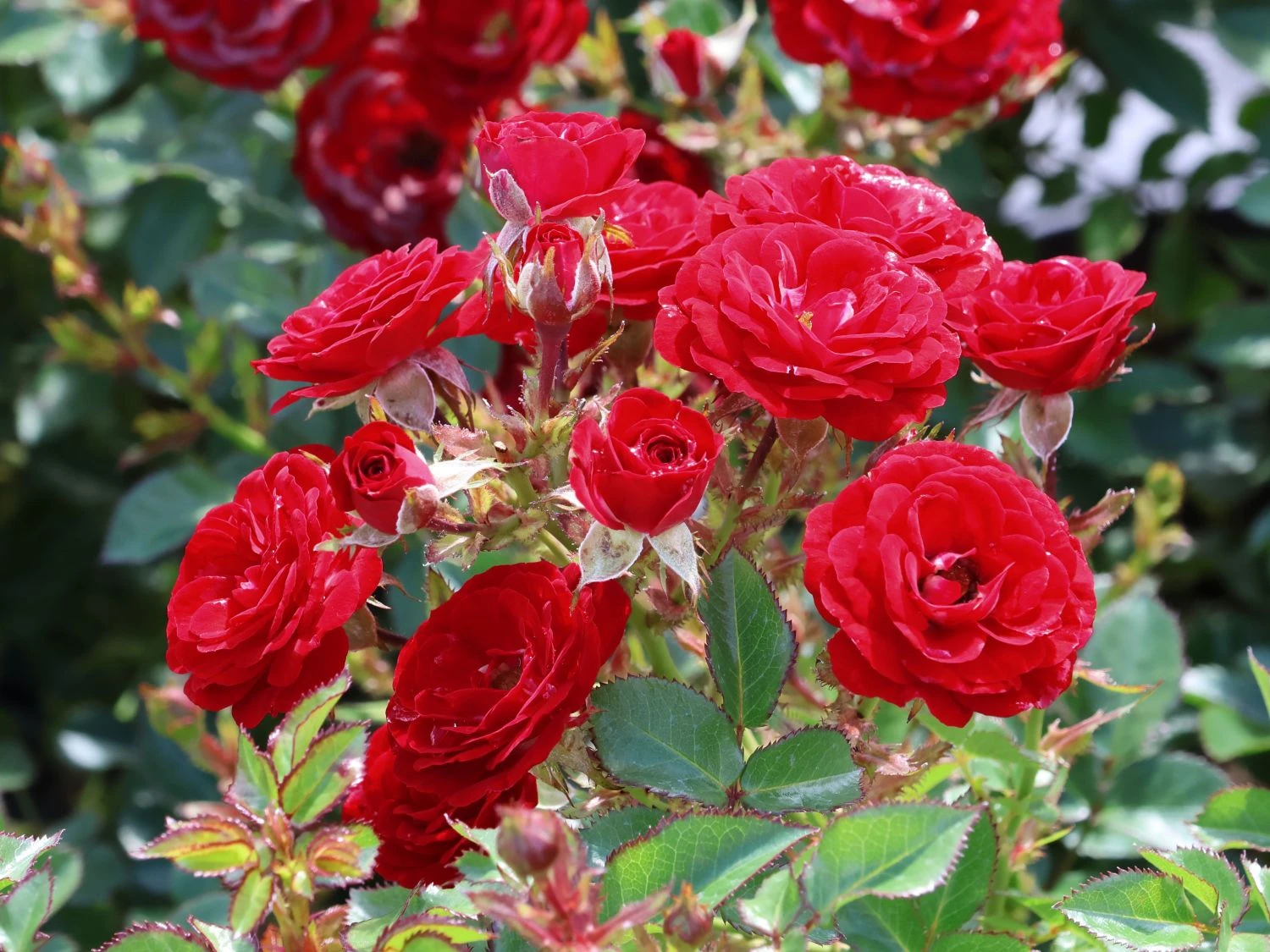 Die Zwergrose ‚Mandy‘ ® ist mit ihrem kompakten Wuchs eine tolle Wahl für verschiedene Beete im Garten. Mit einer Wuchshöhe von 40 bis 50 cm bietet sie sich als farbenfroher Hingucker an, ohne anderen Pflanzen zu viel Licht zu nehmen. Auch eignet sich (bot.) Rosa ‚Mandy‘ ® mit ihrer zwergigen Wuchsform ideal für Kübel und andere Pflanzgefäße auf der Terrasse an. Selbst auf dem kleinsten Balkon ist Platz für den tiefrot blühenden Mini-Rosenbusch. Wie alle Rosen liebt diese Sorte die Sonne, doch die Zwergrose ‚Mandy‘ ® kommt auch mit halbschattigen Standorten gut zurecht. Vielseitig lässt sich die Pflanze in jeden Garten integrieren und trumpft zur Blütezeit groß auf. Von Juni bis September entfalten sich kleine, halbgefüllte Blüten in Dolden. Die blutrote Farbe der Blüten kommt zwischen den dunkelgrünen Blättern besonders schön zur Geltung.
